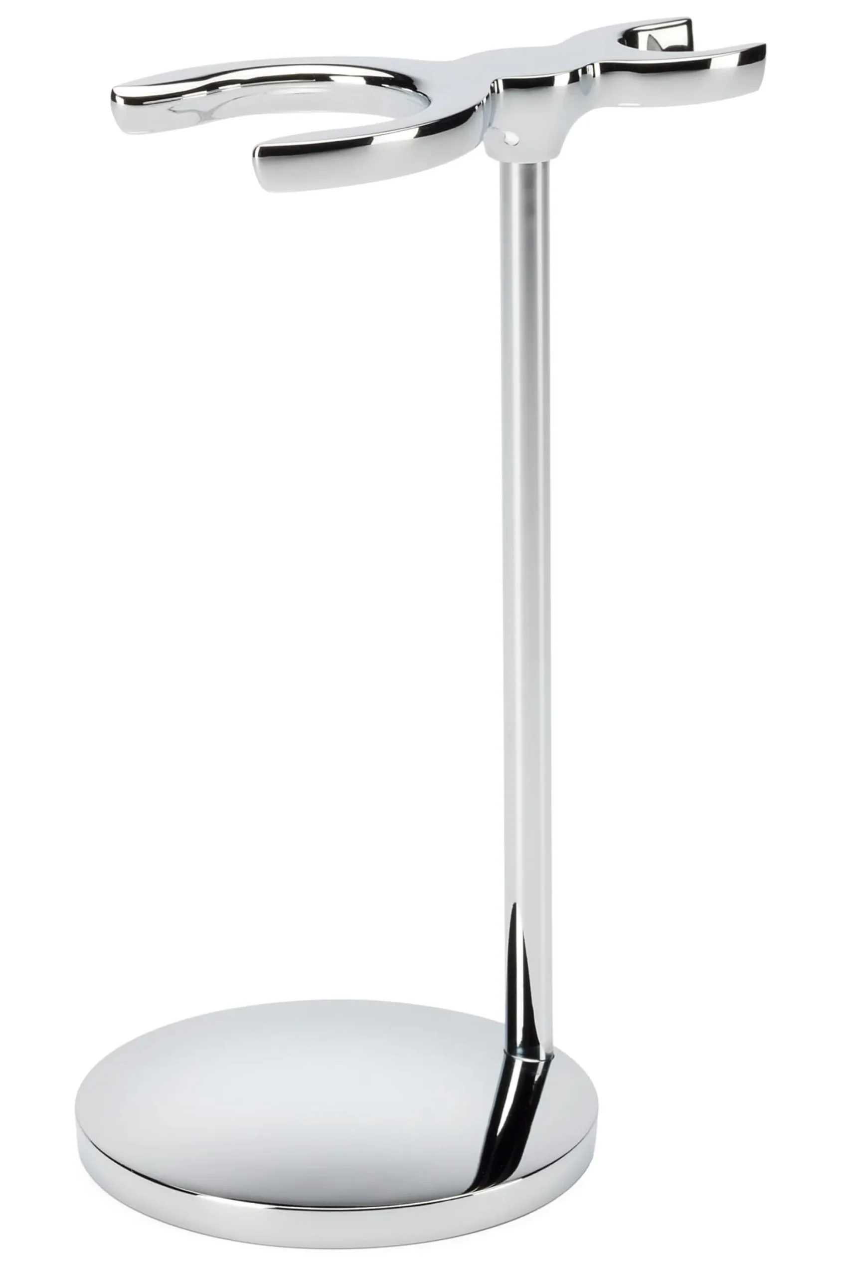 Zink verchromt. Öffnungsweite des Rasierpinselhalters 2,7 cm, Öffnungsweite des Rasierhobelhalters 1,1 cm. Höhe 13,5 cm, Fuß Ø 6,5 cm. Gewicht 180 g.