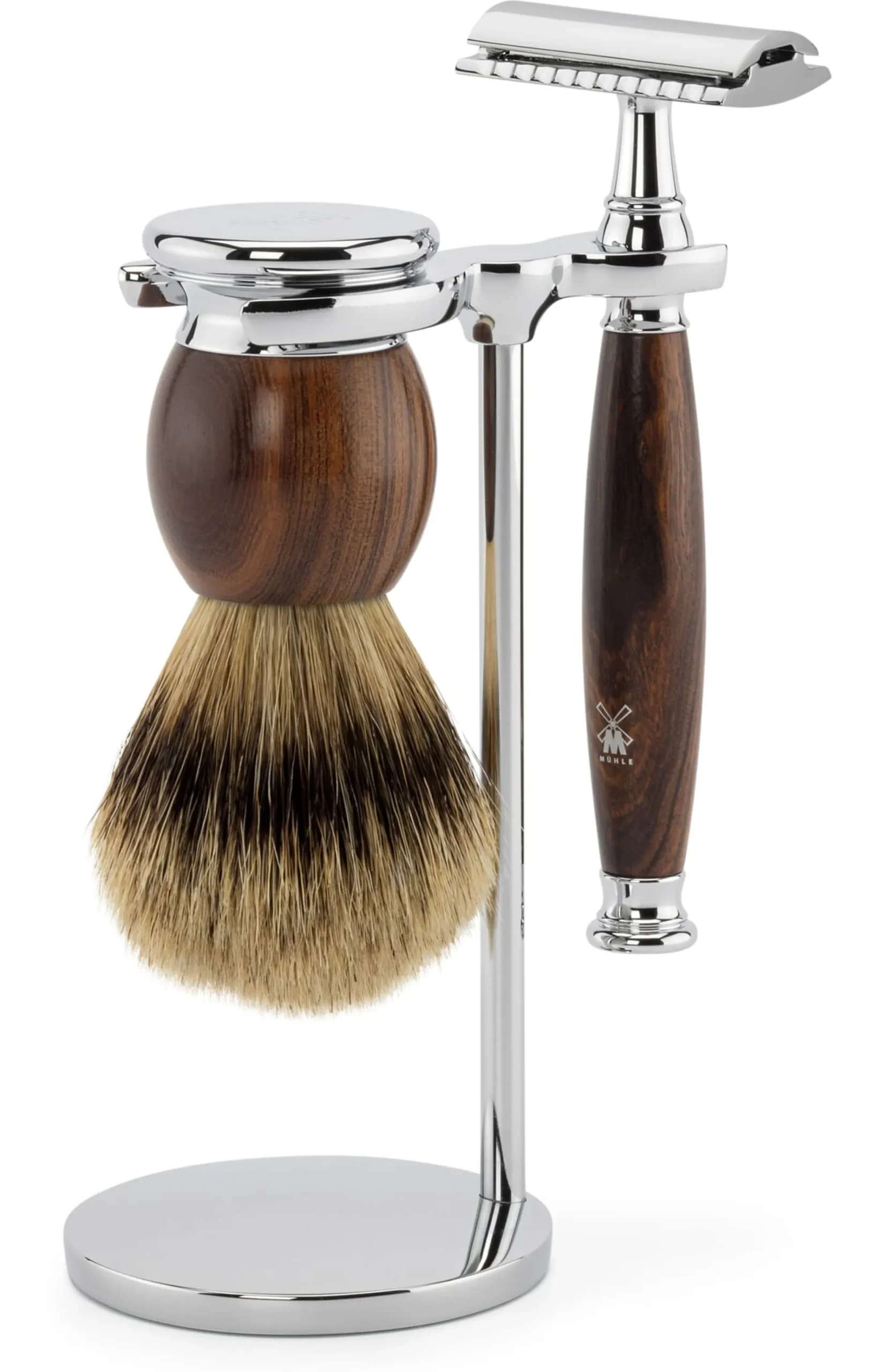 Auf der einen Seite hält der Ständer den Rasierer und auf der anderen den Rasierpinsel, der so – kopfüber hängend – vollständig trocknen kann.