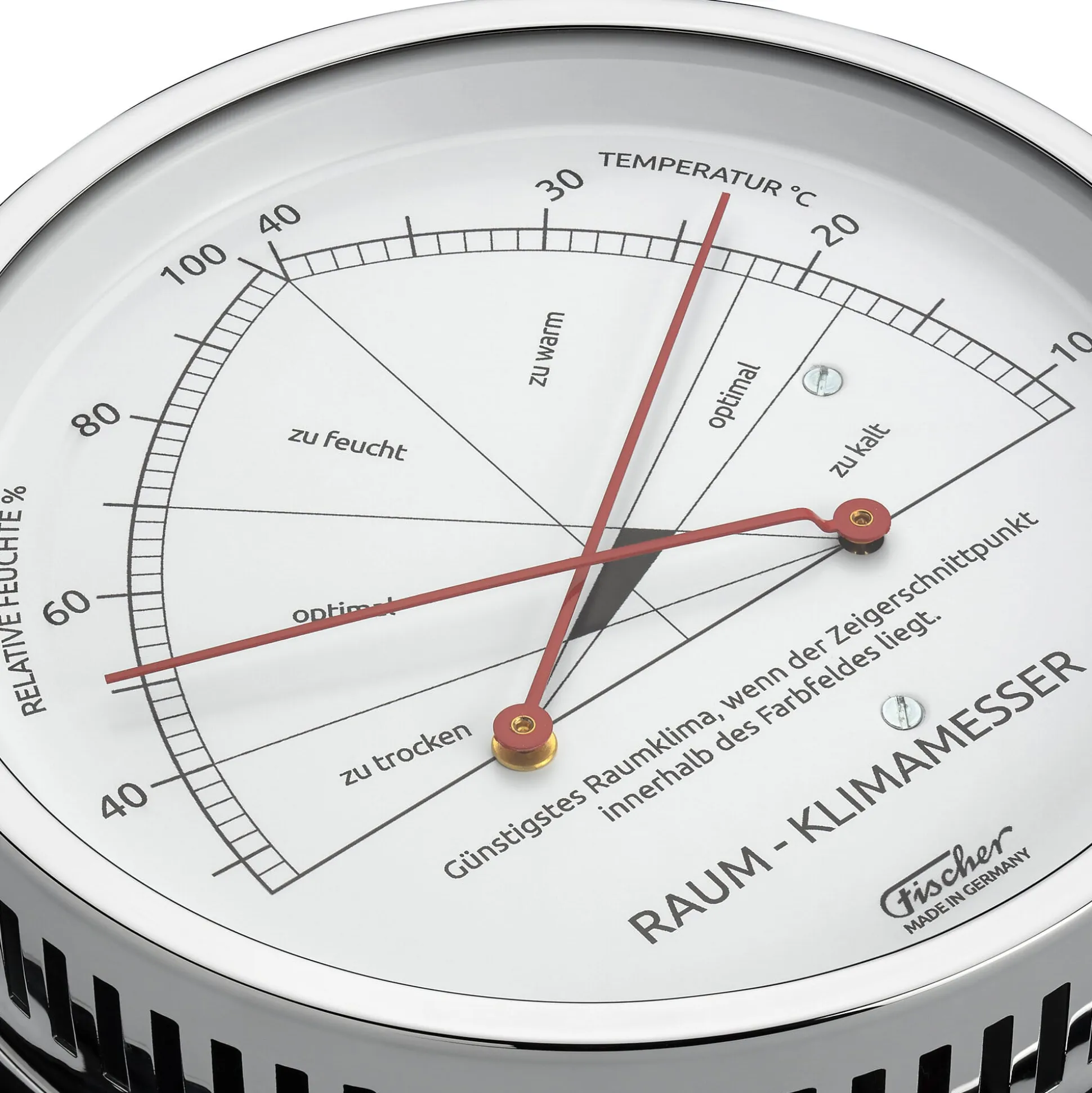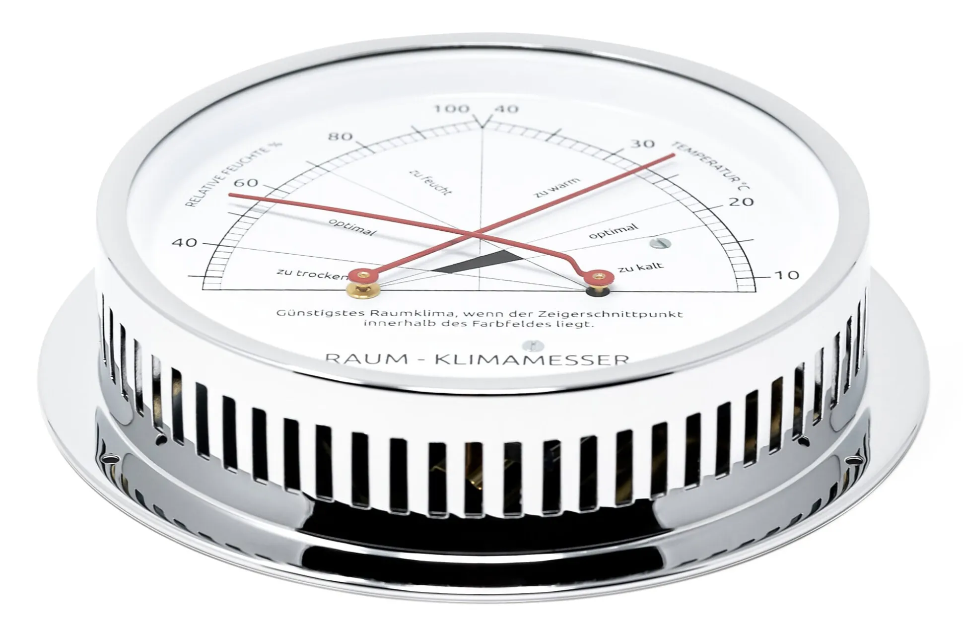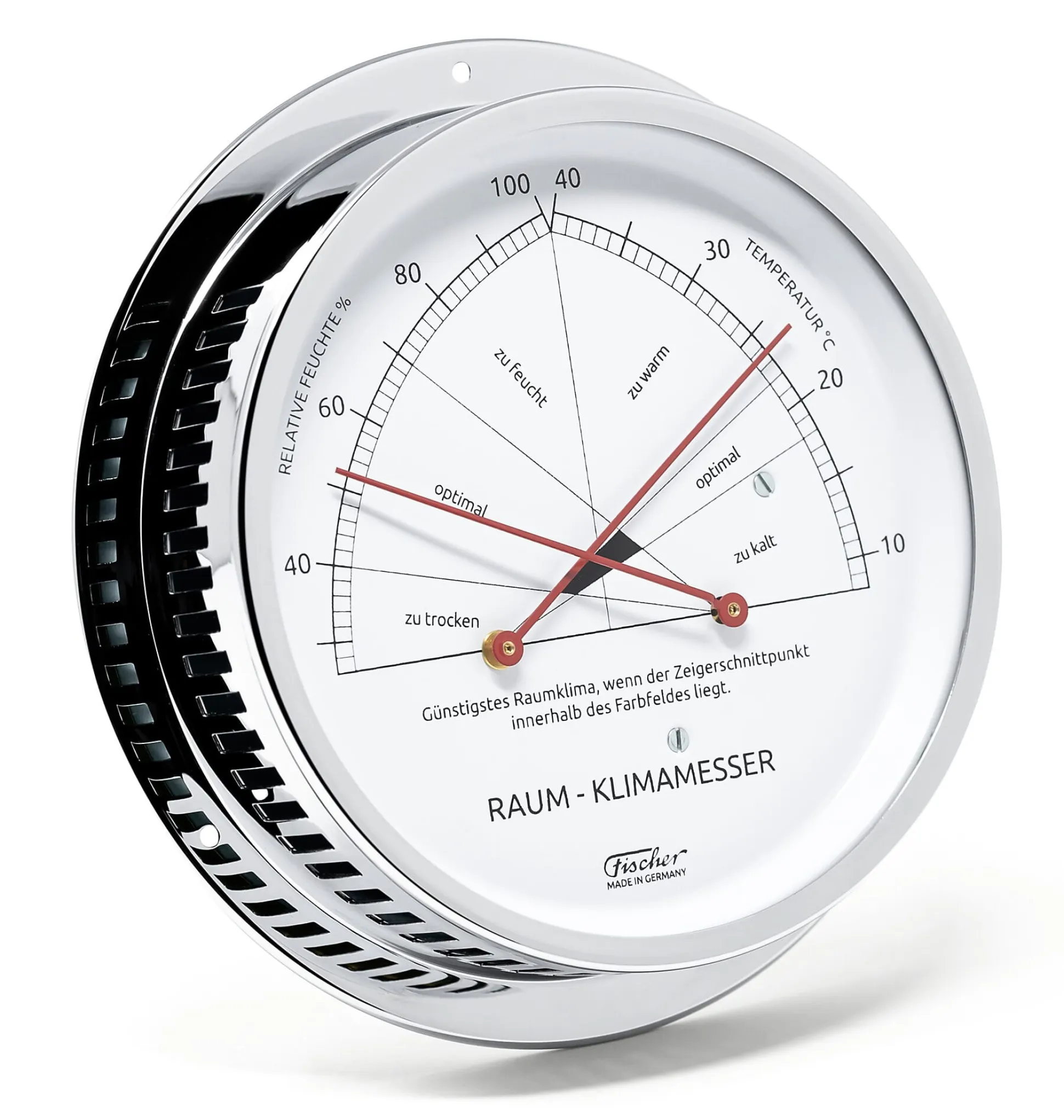 Das Raumklima beeinflusst maßgeblich das Wohlbefinden beim Wohnen und Arbeiten. Entscheidend sind dabei die richtige Temperatur und eine optimale Luftfeuchte. Zimmertemperaturen von 18 bis 22 °C sowie eine Luftfeuchte im Bereich von 40 bis 70% werden – abhängig von der Raumnutzung – als optimal für ein behagliches und gesundes Raumklima angesehen. Dieser mechanische Raum-Klimamesser gibt über beide Messgrößen Auskunft. Er enthält ein hochwertiges Synthetik-Haarhygrometer und ein Bimetall-Thermometer, mit denen er gleichzeitig die relative Luftfeuchte und die Temperatur misst; der Schnittpunkt beider Zeiger gibt Auskunft über die Qualität des Raumklimas. So sehen Sie mit einem Blick, ob die Bedingungen bei Ihnen optimal sind, oder ob es zu warm, zu kalt, zu trocken oder zu feucht ist. Der Raum-Klimamesser ist für Innenräume aller Art geeignet.