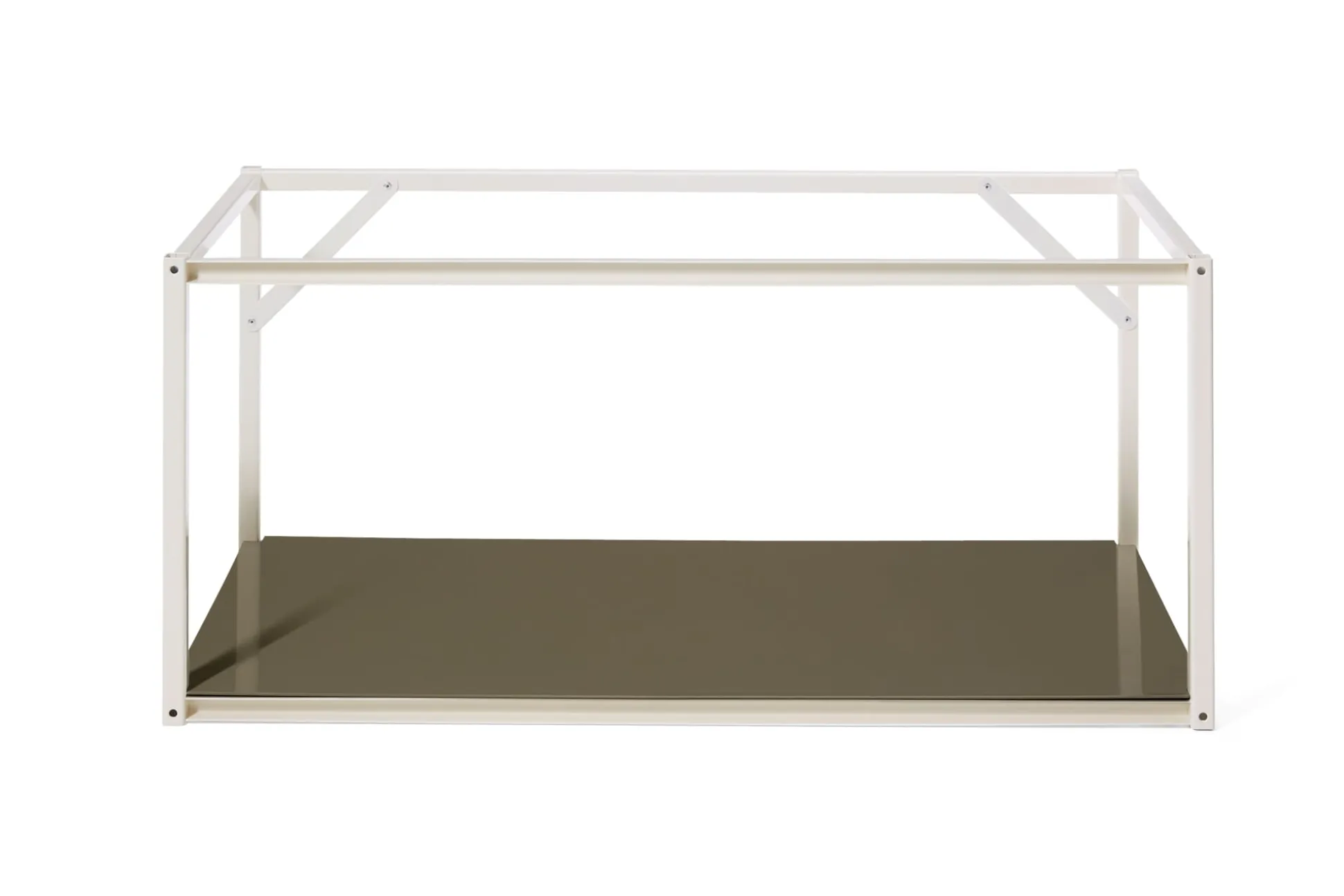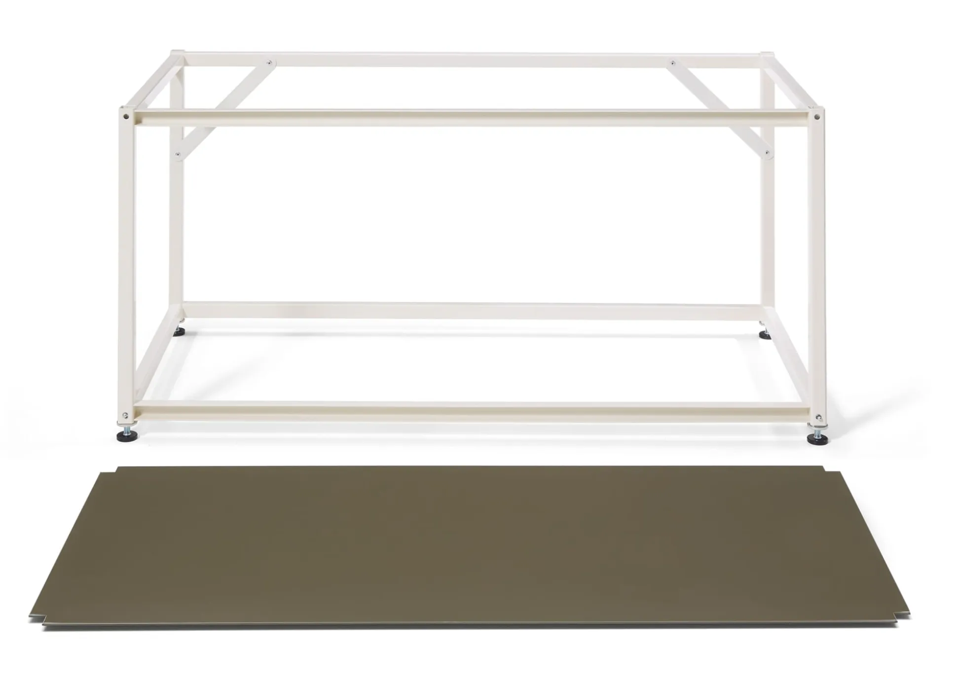 Zum Lieferumfang von TARA gehören vier Verbinder und ein Abdeckboden in Braungrau RAL 7013, den man sowohl als oberen Abschluss sowie als untere Ablage nutzen kann.