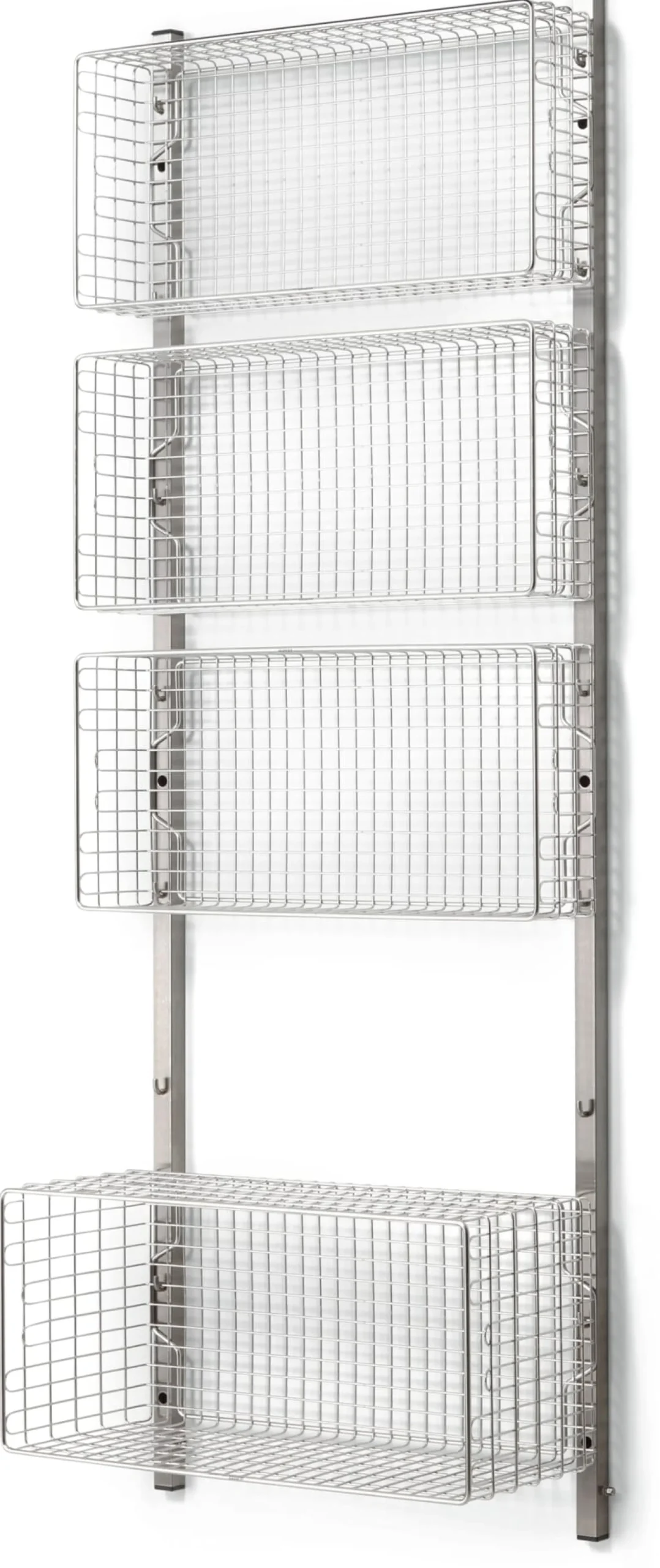 Die Schienen werden mit jeweils drei Dübeln an der Wand montiert, die Körbe dann in gewünschter Höhe werkzeugfrei eingehängt. Zudem kann das System mit weiteren Komponenten – einer Hakenleiste sowie einer einhängbaren Tischplatte – frei kombiniert und erweitert werden. Alle Elemente sind aus elektrolytisch poliertem Stahl gefertigt, sind somit nahezu unkaputtbar und leicht zu reinigen.