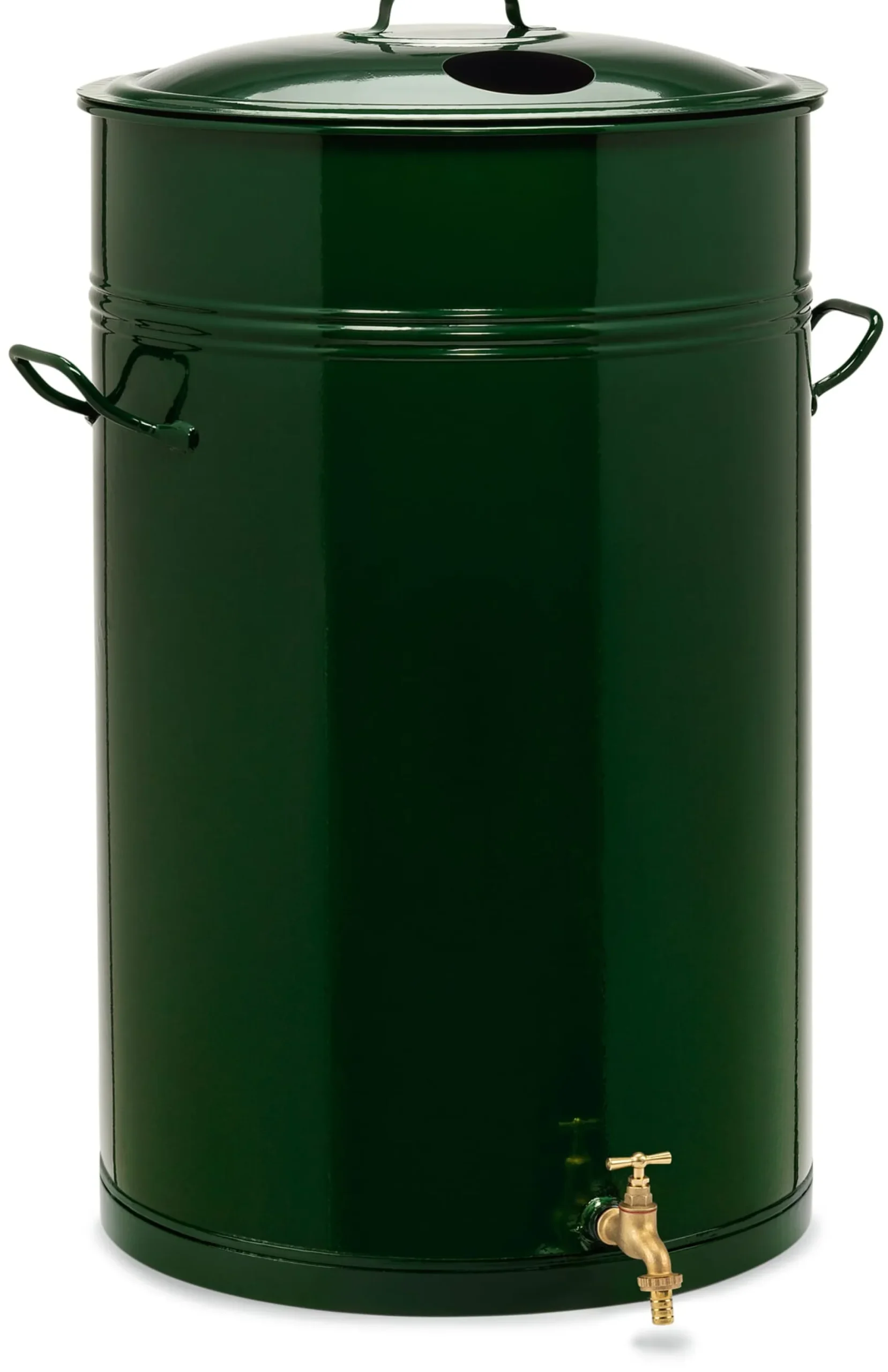 Tonne mit Deckel, Hahnanschluss und Überlauf. Stahlblech feuerverzinkt und tannengrün pulverbeschichtet (RAL 6009). Aussparung im Deckel (Ø 10 cm) für den Anschluss ans Fallrohr. Tonne innen Ø 50 cm, außen Ø 52 cm. Breite (mit Griffen) 65 cm. Höhe ohne Deckel gemessen 84 cm, mit Deckel gemessen 93 cm. Gewicht 15 kg. Fassungsvemögen 150 Liter. Lieferung inklusive Messinghahn (½“) mit Schlauchtülle. Hergestellt in Deutschland.