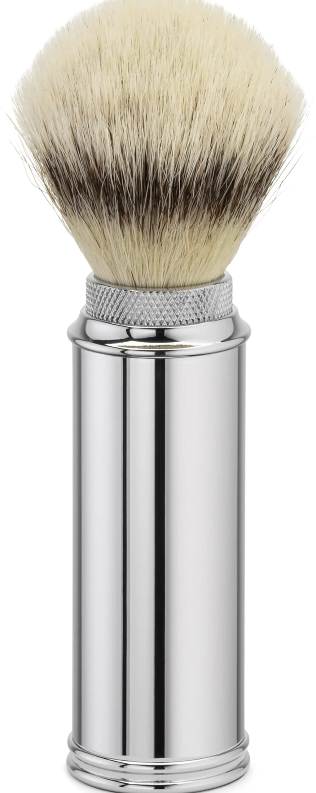 Wenn Sie auch auf Reisen nicht auf das morgendliche Ritual einer gründlichen Nassrasur verzichten möchten, ist dieser Reiserasierpinsel Ihr pefekter Begleiter. Der Besatz – wahlweise aus bewährtem echtem Dachshaarzupf oder aus Synthetikhaar – ist lediglich etwas kürzer gehalten. Nach dem Aufschrauben des Gehäuses wird die Schutzhülse zum Pinselgriff. Der Schraubdeckel ist mit mehreren Bohrungen versehen, um das (Nach-)Trocknen des Besatzes auch einmal in der Hülse zu ermöglichen. Darauf sollten Sie insbesondere beim Dachshaarbesatz aber nur in Ausnahmefällen zurückgreifen und den Besatz ansonsten stets gut abtrocknen lassen.
