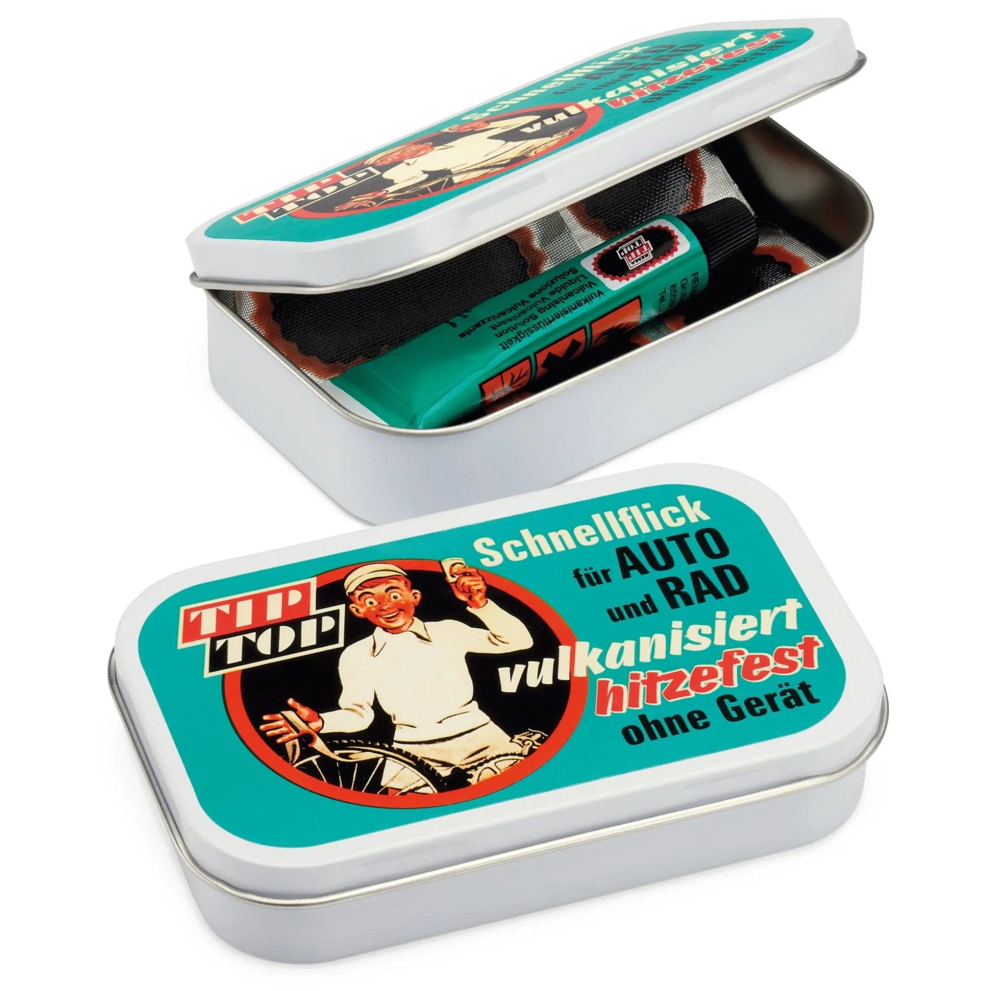 Hier kommt das klassische Reparatur-Set für Reifenpannen am Fahrrad, von Rema Tip Top aus dem bayerischen Poing, einem führenden Hersteller von Gummibauteilen für die Anlagenindustrie und Spezialisten in Sachen Förderbandinstandhaltung und Verschleißschutz, der seit den 1930er Jahren Schlauchflicken und Reifenpflaster herstellt. Es enthält alles, was man zum fachgerechten und zügigen Beheben eines Platten braucht: Gummiflicken verschiedener Größe, Schleifpapier zum Aufrauhen der Schlauchoberfläche, Gummilösung zum Vulkanisieren und einen Ventilschlauch. Aufbewahrt ist das alles in einer handlichen Blechdose, die in jede Sattel- oder Jackentasche passt. Ihre einem historischen Vorbild folgende Gestaltung sieht nicht nur schön aus, sie ist auch ein beredter Beleg dafür, wie lange sich dieses bewährte Flickzeug schon am Markt behauptet.