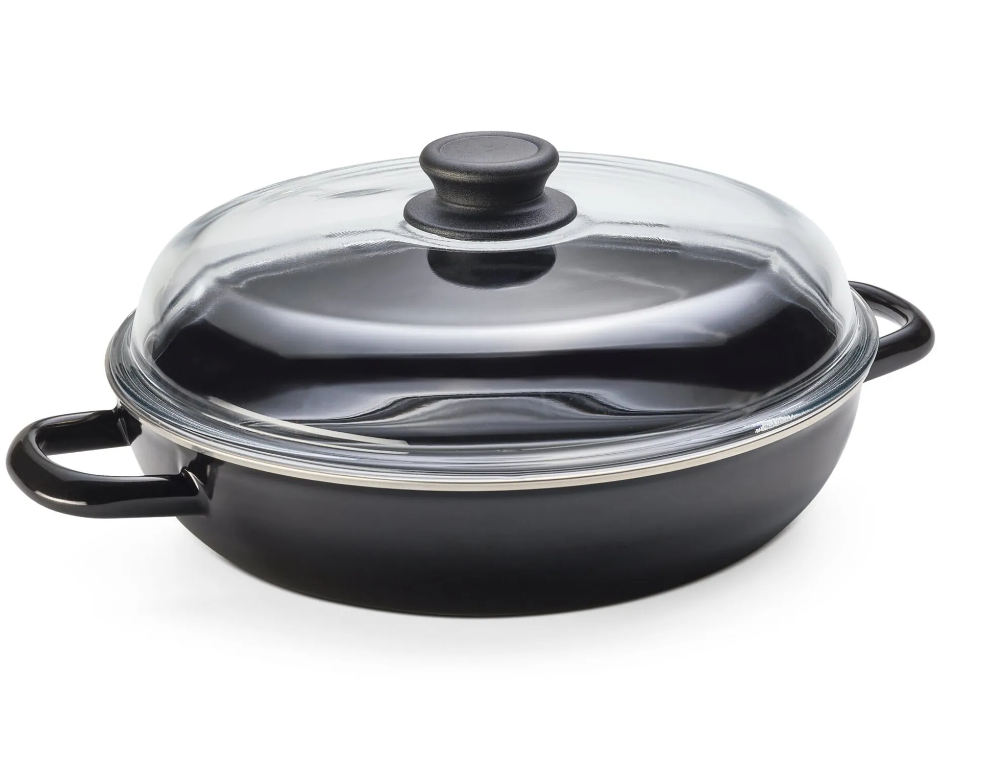 Diese Emaille-Schmorpfannen von Riess in Österreich werden mit Glasdeckel geliefert. Garvorgang und -fortschritt bleiben darunter stets unter Kontrolle. Ob die Hitzezufuhr reguliert oder möglicherweise etwas Flüssigkeit nachgefüllt werden muss, lässt sich auf einen Blick erkennen. Mit dem Knauf aus Duroplast sind die Deckel sogar ofenfest, was eine Verwendung der Pfannen als Bräter ermöglicht.