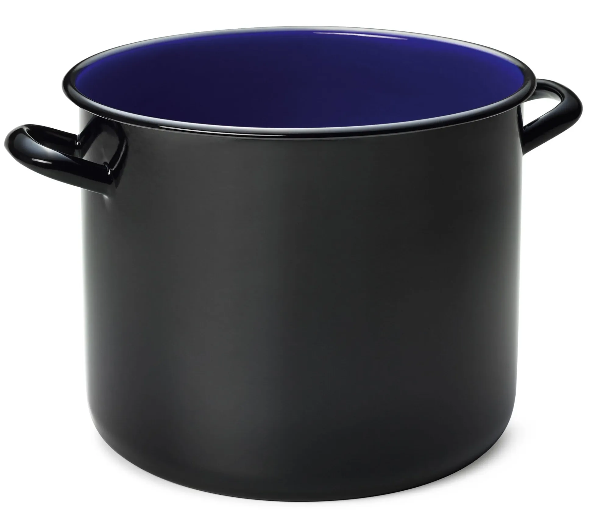 Eisen emailliert, außen schwarz, innen kobaltblau emailliert. Ohne Deckel.