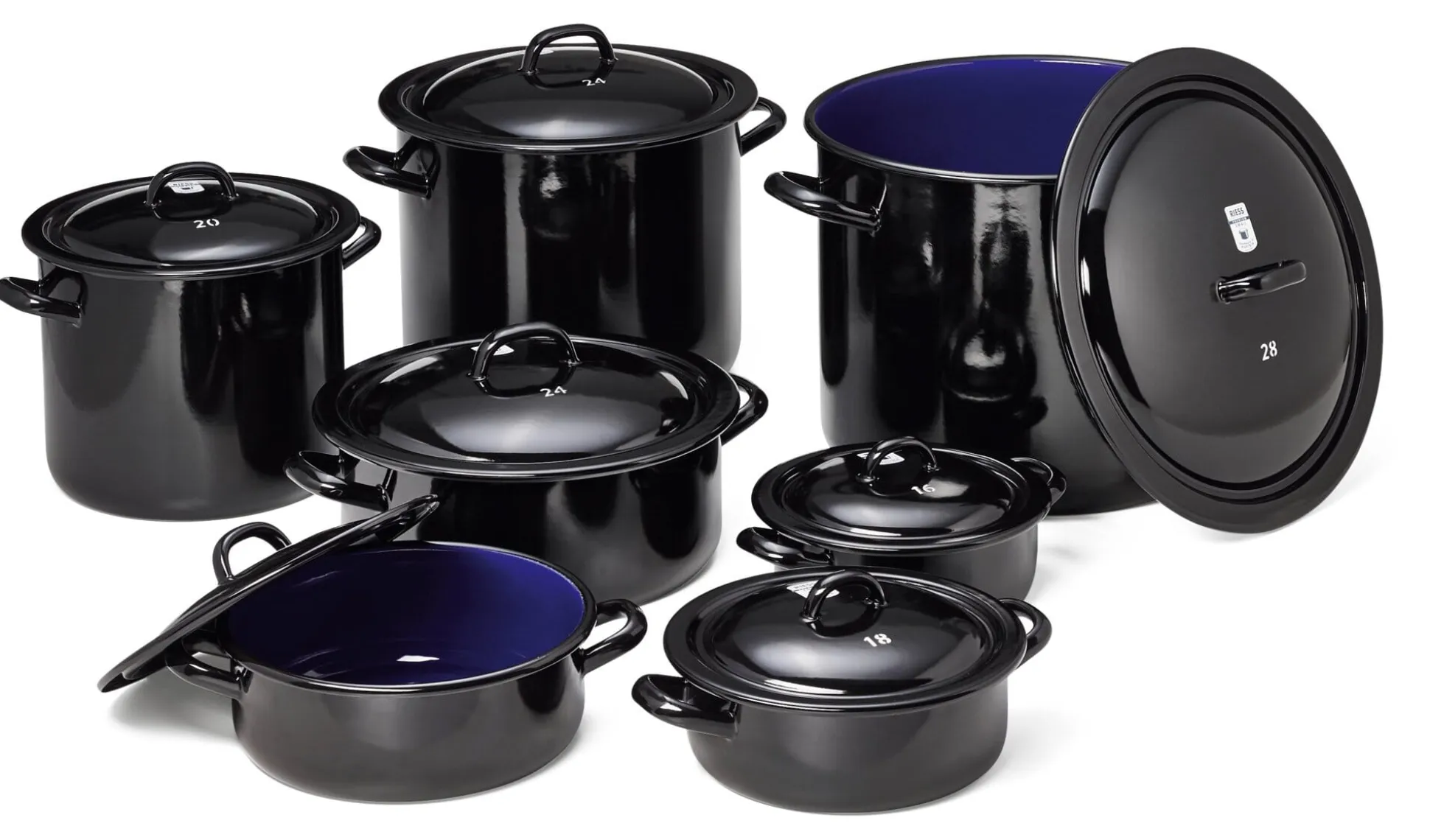 Emaillierte Kochtöpfe, der kleinste mit vier Litern Volumen als Fleisch- und Bratentopf, der mittlere mit acht Litern Volumen für Kartoffeln und Gemüse, der ganz große mit stolzen 12 Litern Volumen vorrangig als Suppentopf. Von Riess in Österreich und in der klassischen Farbkombination.