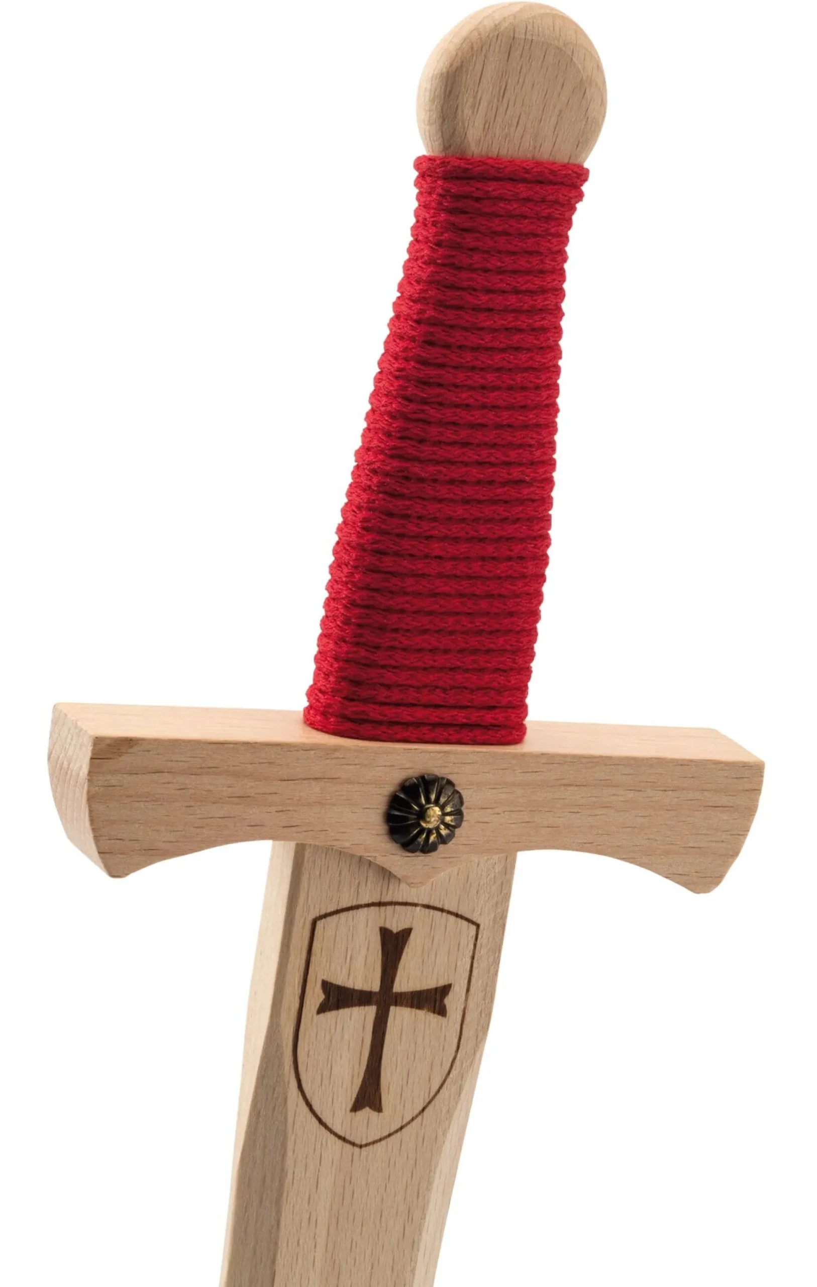 Aus Buchenholz, massiv und unbehandelt. Der Griff ist mit einer roten Baumwollkordel umwickelt, Stärke 3 mm. Scheide aus weißem, echtem Wollfilz, unbehandelt. Bindegürtel Hanf. Das Emblem auf der Scheide wird im Siebdruckverfahren aufgebracht, das Emblem auf der Klinge wird aufgebrannt. Gefertigt in Deutschland.