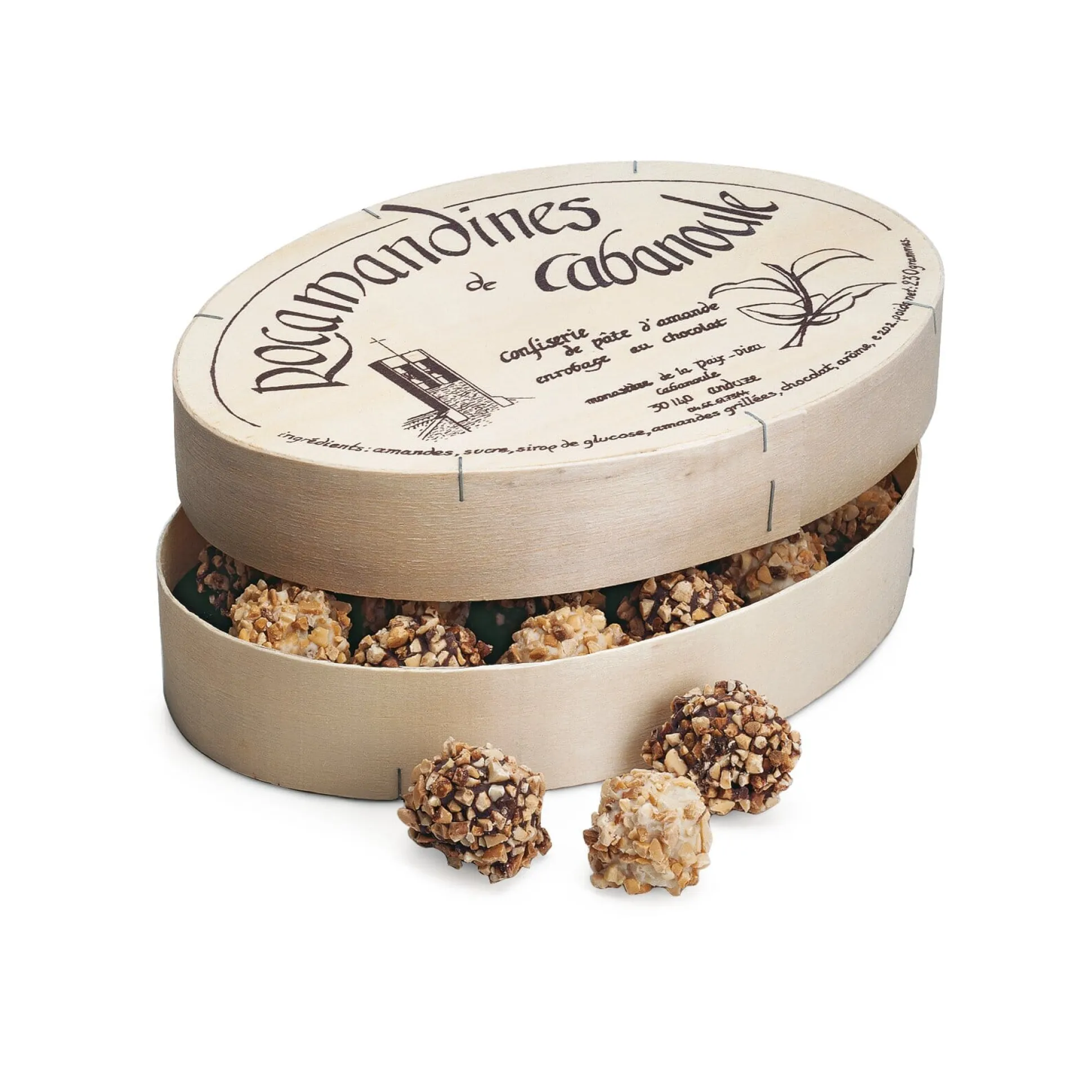 Fein gehackte Mandeln umhüllen diese Confiserie-Klassiker südfranzösischer Zisterzienserinnen aus der Abtei Paix-Dieu bei Anduze: Rocamandines au Chocolat sind handgemachte Pralinenkugeln aus Marzipan, abwechselnd mit dunkler und weißer Schokolade und gehackten Mandeln umhüllt und liebevoll in einer Geschenkschachtel verpackt.