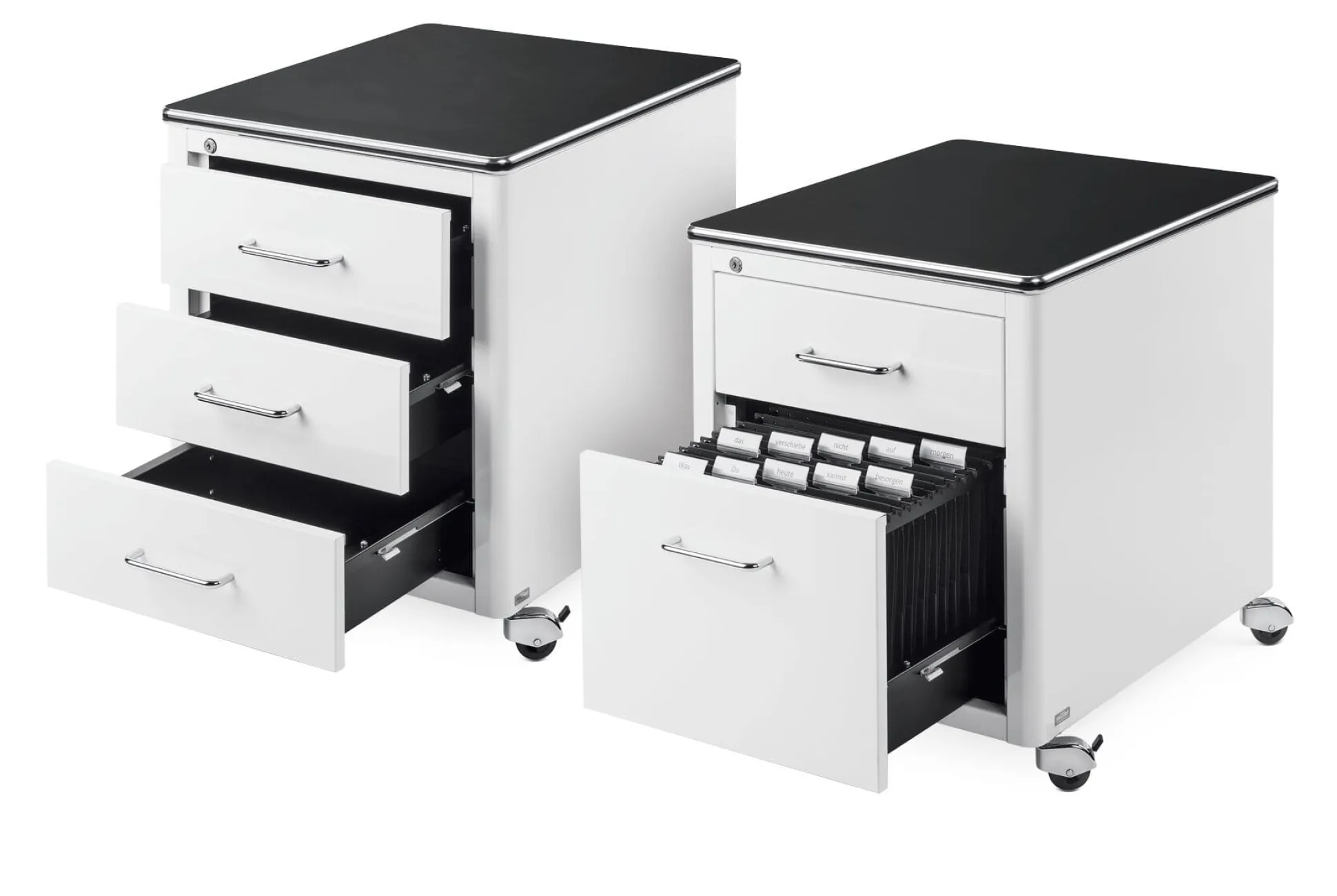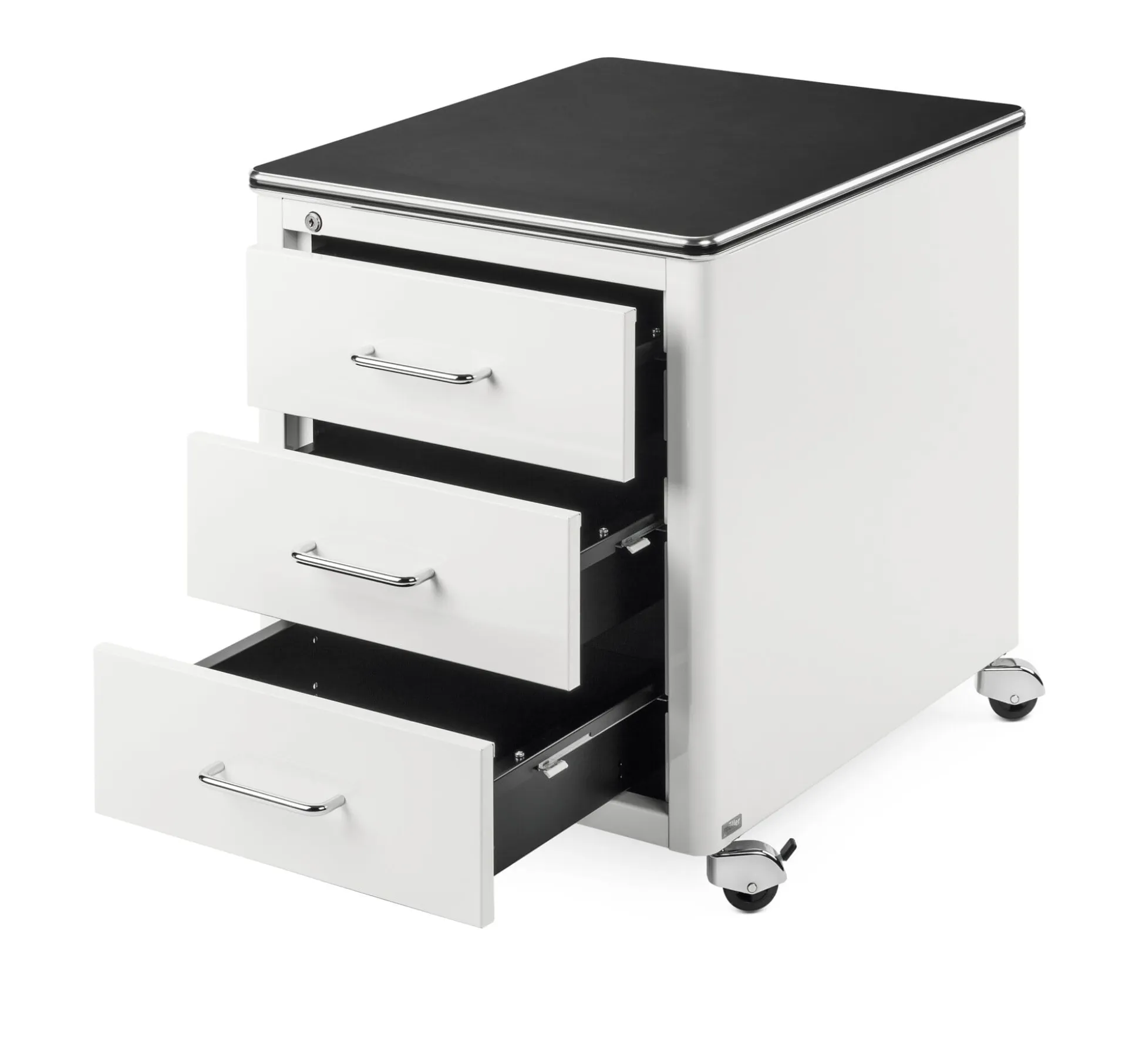 Rollcontainer aus 1 mm starkem, in frei wählbarer RAL-Farbe lackiertem Stahlblech, mit Zentralverriegelung. Vier Lenkrollen, die beiden vorderen feststellbar. Deckplatte Tischlerplatte mit Linoleumbelag. Farbe Weiß, mit schwarzer Deckplatte. Mit drei Schubladen. Hergestellt in Deutschland.