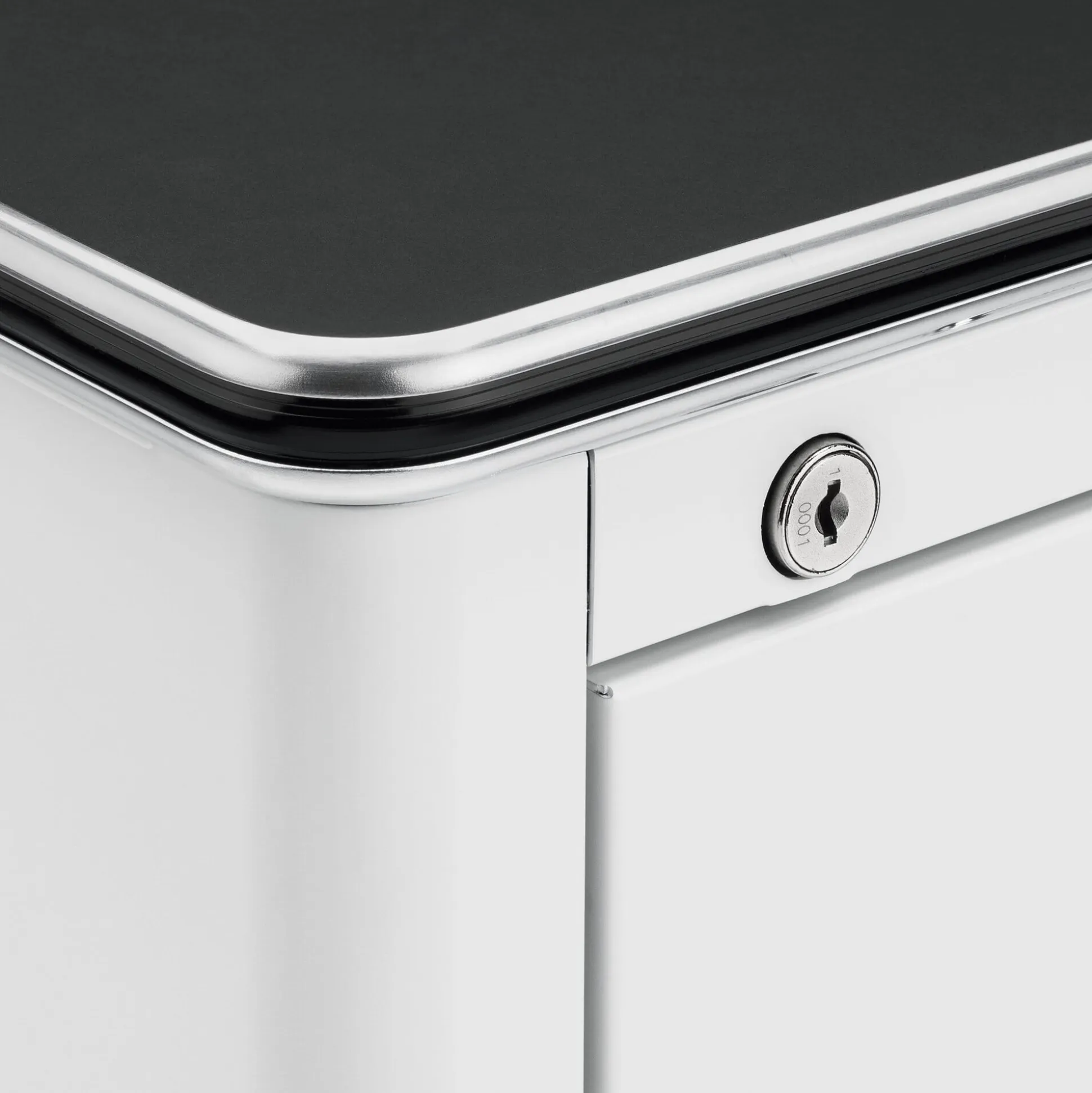 Wahlweise mit drei Schubladen oder mit einer Schublade und einem Hängeregistraturauszug ausgestattet, stellt der Rollcontainer ein funktional-kompaktes Büromöbel dar, das die Utensilien und Unterlagen bzw. die Hängeregistraturmappen der täglichen Arbeit aufnimmt. Insbesondere bietet er sich als freistehendes bzw. beigestelltes Arbeitsmöbel an, das mit seiner Ablagefläche zugleich die Funktion eines kleinen Tisches erfüllen kann. Im Bedarfsfall ist er auch als Untertischcontainer für Arbeitstische, die nicht mit einer Kastenkomponente ausgestattet sind, zu verwenden. Mit seinen vier Lenkrollen (die vorderen sind feststellbar) ist er außerdem mobil und kann jederzeit einer anderen Funktion im Raum zugeführt werden – falls Sie ihn in diesem Augenblick unter dem Schreibtisch, einen Moment später aber lieber daneben oder frei im Raum stehend nutzen möchten.