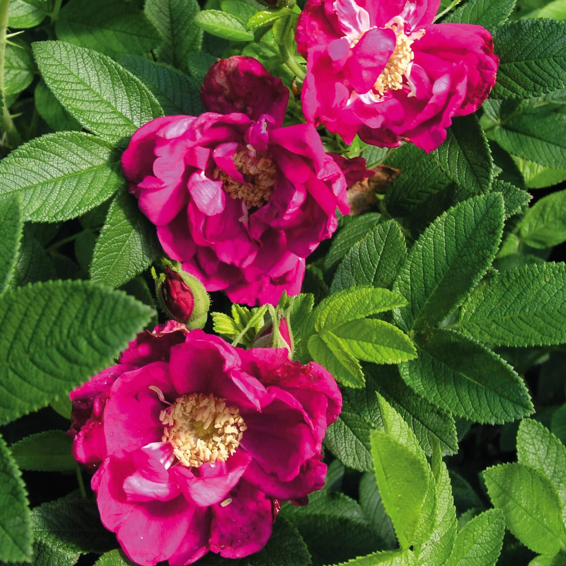 Für solchen Zweck und Standort optimal geeignet sind die Kartoffelrosen (Rosa rugosa). Sie sind unempfindlich und robust, sehr frosthart und salzverträglich. Sie blühen reich und ausgesprochen ausdauernd: von Juni an mit kleinen Unterbrechungen bis Anfang Oktober. Nach den duftenden Blüten setzen die Pflanzen große, rote Hagebutten an, die zusammen mit der gelben Herbstfärbung auch spät im Jahr noch schöne Akzente setzen. Wir haben vier Sorten ausgewählt, die sich zudem durch einen kompakten, breitbuschigen und überhängenden Wuchs auszeichnen. Ihr tiefgrünes, glänzendes Laub ist gesund; die ganze Pflanze ist stark bestachelt und damit noch mal so gut als Grenzbepflanzung geeignet – aber natürlich auch für die Einzelpflanzung an jedem anderen ausreichend besonnten Platz im Garten.