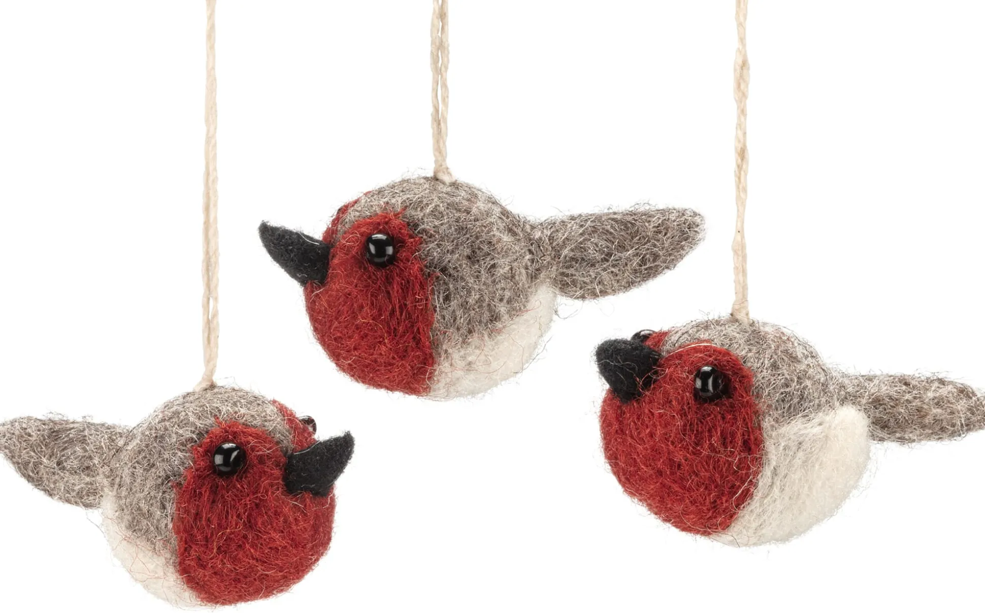 Weihnachtliche Tischdekoration, festlicher Raum- und Fensterschmuck oder auch als Teil eines Mobiles: Diese drei aus reiner Schurwolle gefilzten, stilisierten Rotkehlchen können Sie vielen stimmungsvollen Zwecken zuführen. Vor allem im Weihnachtsbaum machen sie eine ansprechende Figur.