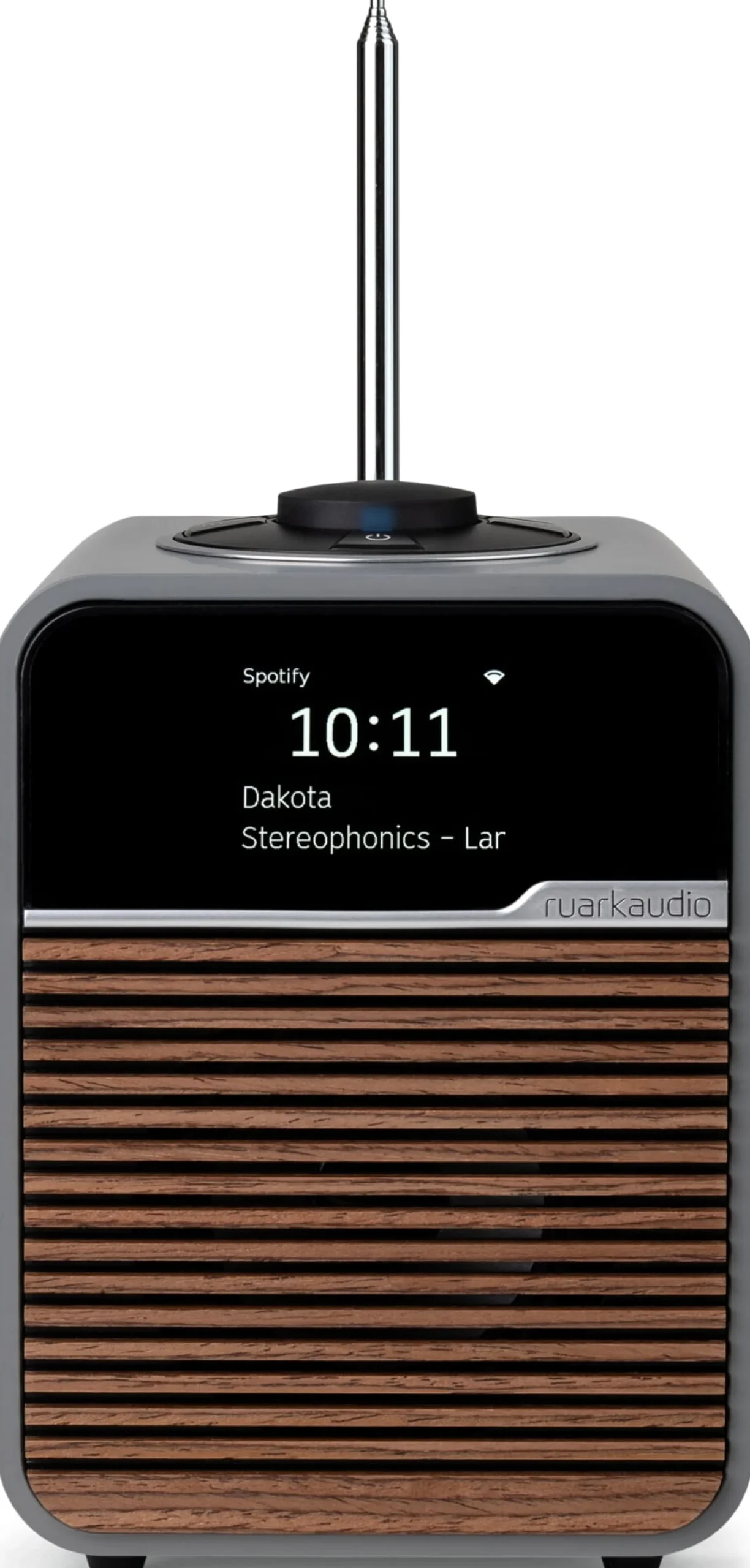 Das Tischradio R1 ist ein echter Klassiker von Ruark Audio. Das Modell R1S zeigt auf seiner aufgeräumten Vorderseite ein großes TFT-Farbdisplay, das sich durch hohe Kontrastwerte sowie eine klare und lebendige Farbwiedergabe auszeichnet. Es zeigt die Uhrzeit sowie Informationen zu Programmen und Einstellungen an – gestochen scharf und aus jedem Blickwinkel ablesbar. Seine Helligkeit passt sich automatisch unterschiedlichen Lichtverhältnissen an, was stets für visuelle Klarheit sorgt – sei es im hellen Sonnenlicht oder an einem gemütlichen Abend bei gedämpfter Beleuchtung.