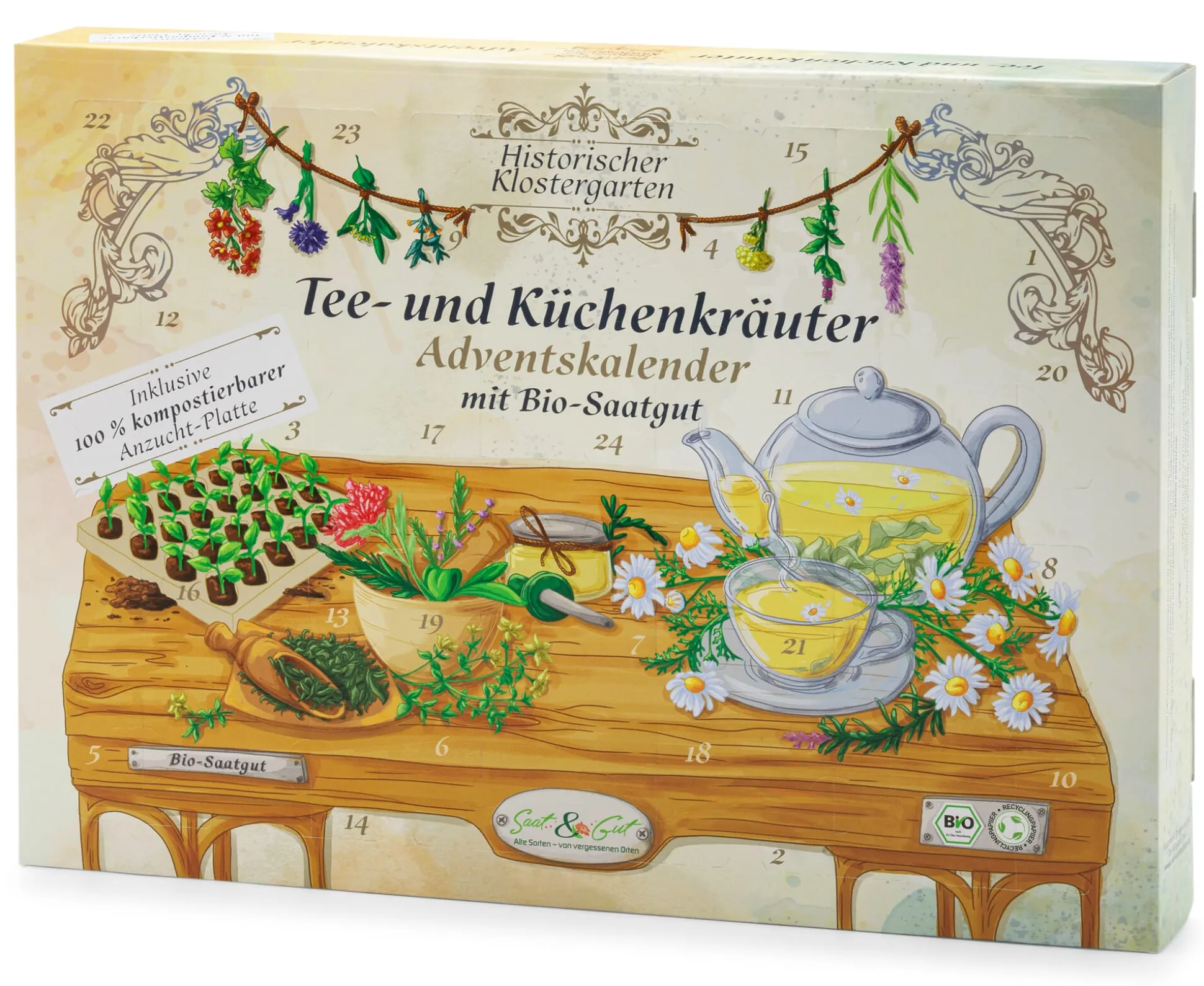 Mit diesem Saatgut-Adventskalender verschenken Sie 24 Mal Vorfreude – auf das Weihnachtsfest ebenso wie auf eine mit duftender Kräuterernte gesegnete Garten- und Balkonsaison im neuen Jahr. Der Schwerpunkt liegt auf Tee- und Küchenkräutern, wie sie seit Jahrhunderten in den Klostergärten der Welt wachsen und gedeihen. Von Klassikern der mediterranen Küche bis zu bekannten und eher unbekannten Heilkräutern reicht die Auswahl. Den Blättern der Blauen Malve etwa wird nachgesagt, dass sie als Tee aufgebrüht Atemwegsbeschwerden zu lindern in der Lage seien. Schafgarbe soll entzündungshemmend wirken, Lavendel beruhigend, und Johanniskraut bei Magenbeschwerden helfen. Getrocknete Ringelblumenblüten bereichern süße Desserts, die jungen Blätter der Speisechrysantheme munden im Salat und Zitronenmelisse passt zu Obstsalat und vielerlei Mixgetränken, ob kalt oder warm aufgegossen. Das Bio-Saatgut stammt sämtlich aus heimischem Anbau im Raum Göttingen. Gut zu wissen: Hinter der Karton-„Fassade“ dieses Saatgut-Adventskalenders verbirgt sich eine Anzuchtschale aus Pulp mit 24 Vertiefungen, die im Frühjahr zur Aussaat auf der Fensterbank genutzt werden kann. Aussaatanleitungen sind jedem der 24 Tütchen aufgedruckt, der*die Beschenkte braucht lediglich für geeignete Aussaaterde zu sorgen. Sämtliche Bestandteile des Kalenders sind zu 100% recyclebar und lassen sich im Altpapier entsorgen.