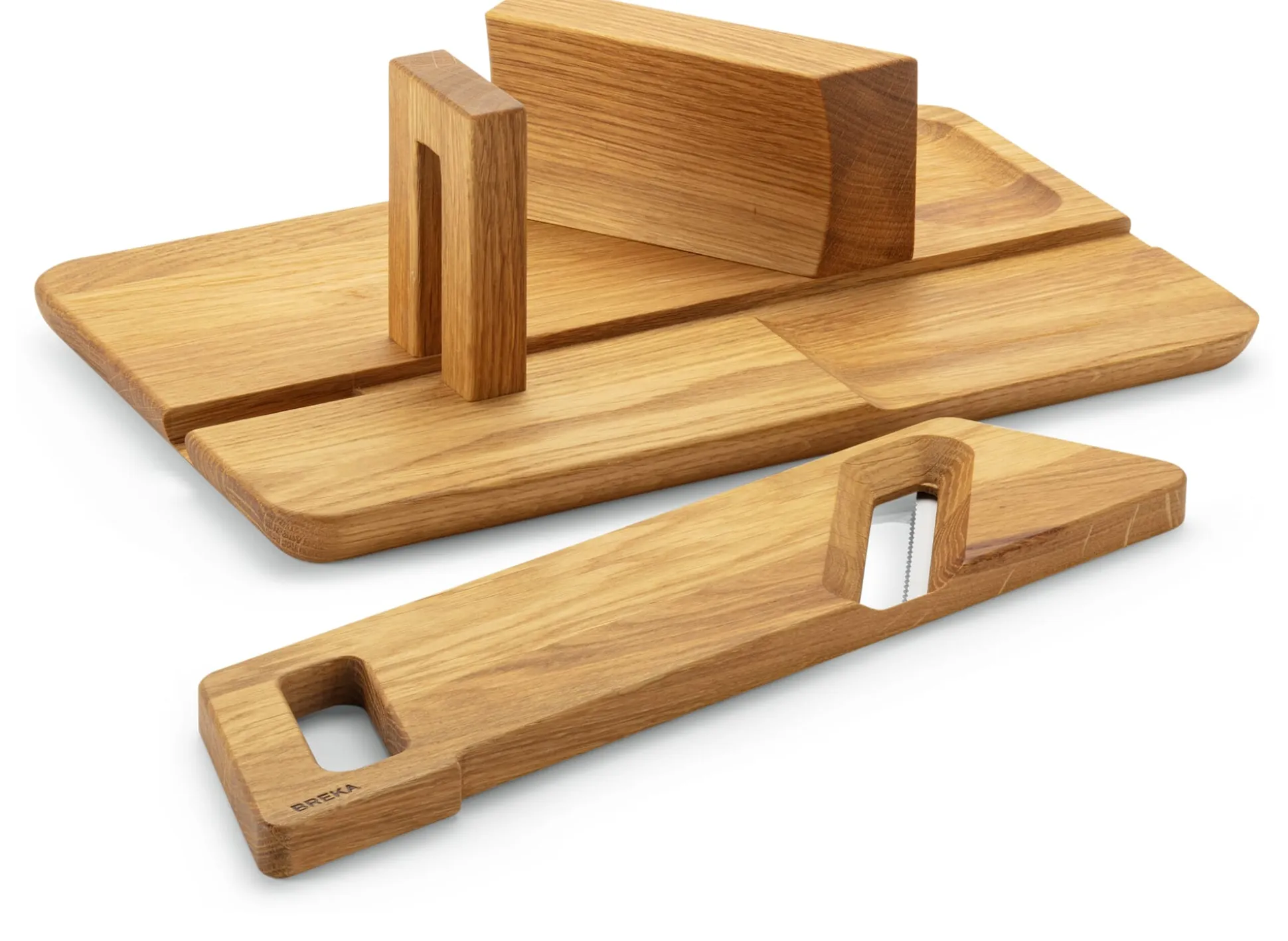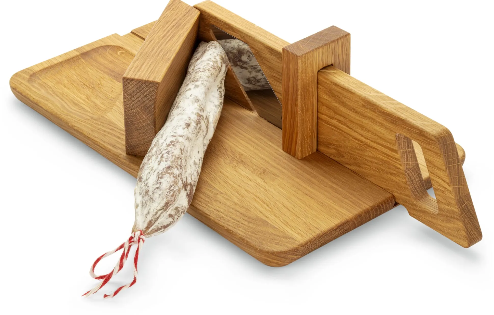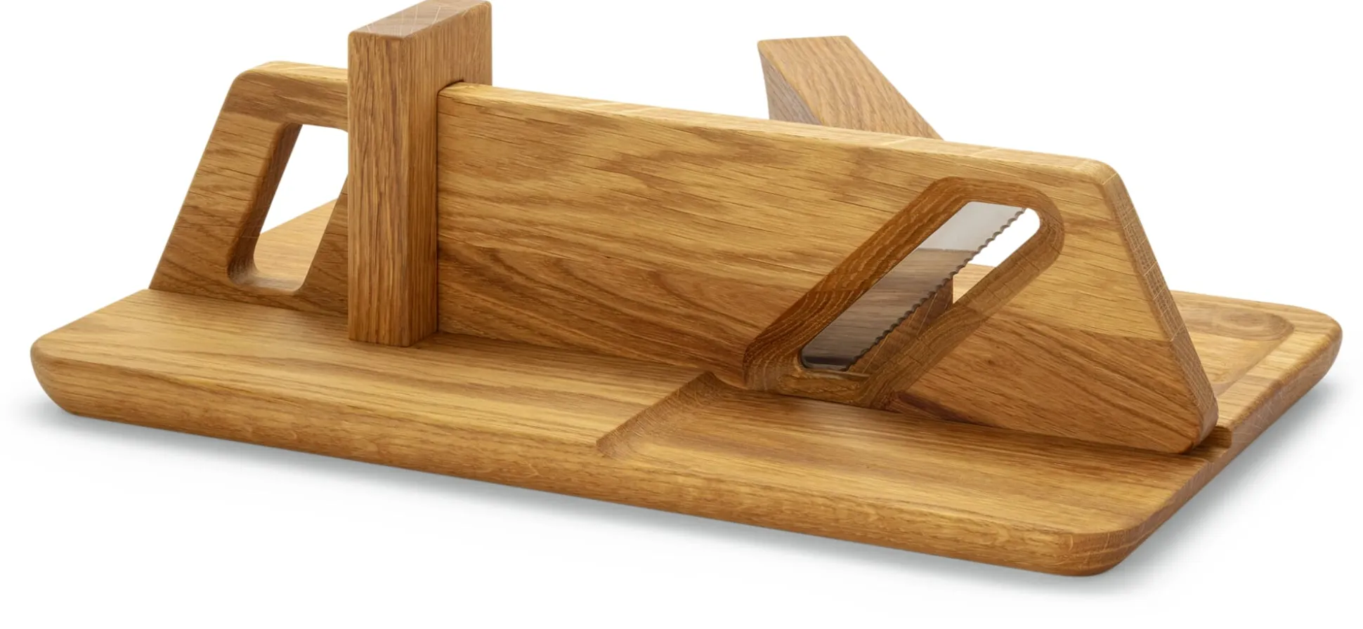 Korpus Eichenholz geölt. Gezahnte Klinge aus Edelstahl (3,5 x 7,5 cm) von Victorinox in der Schweiz. Hergestellt in Slowenien. Länge 32,5 cm, Breite 20 cm, Höhe 10 cm. Gewicht 1,2 kg.