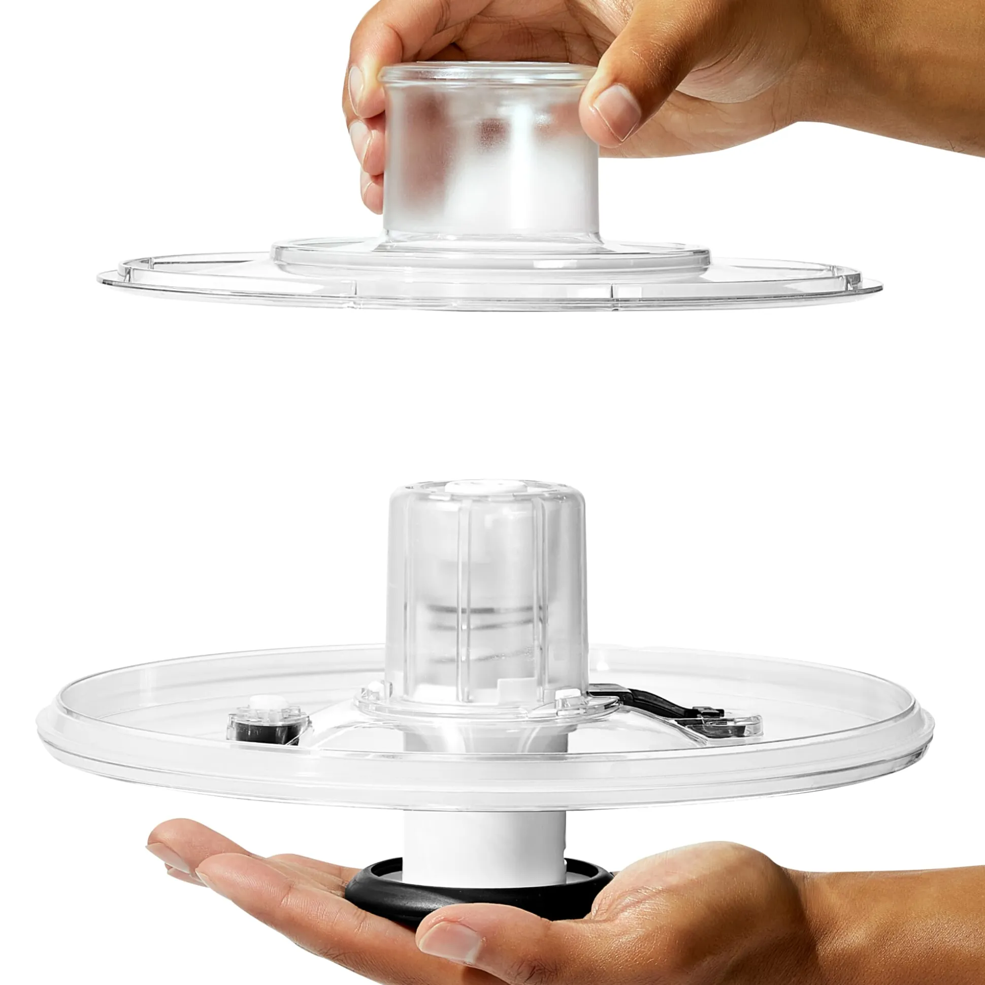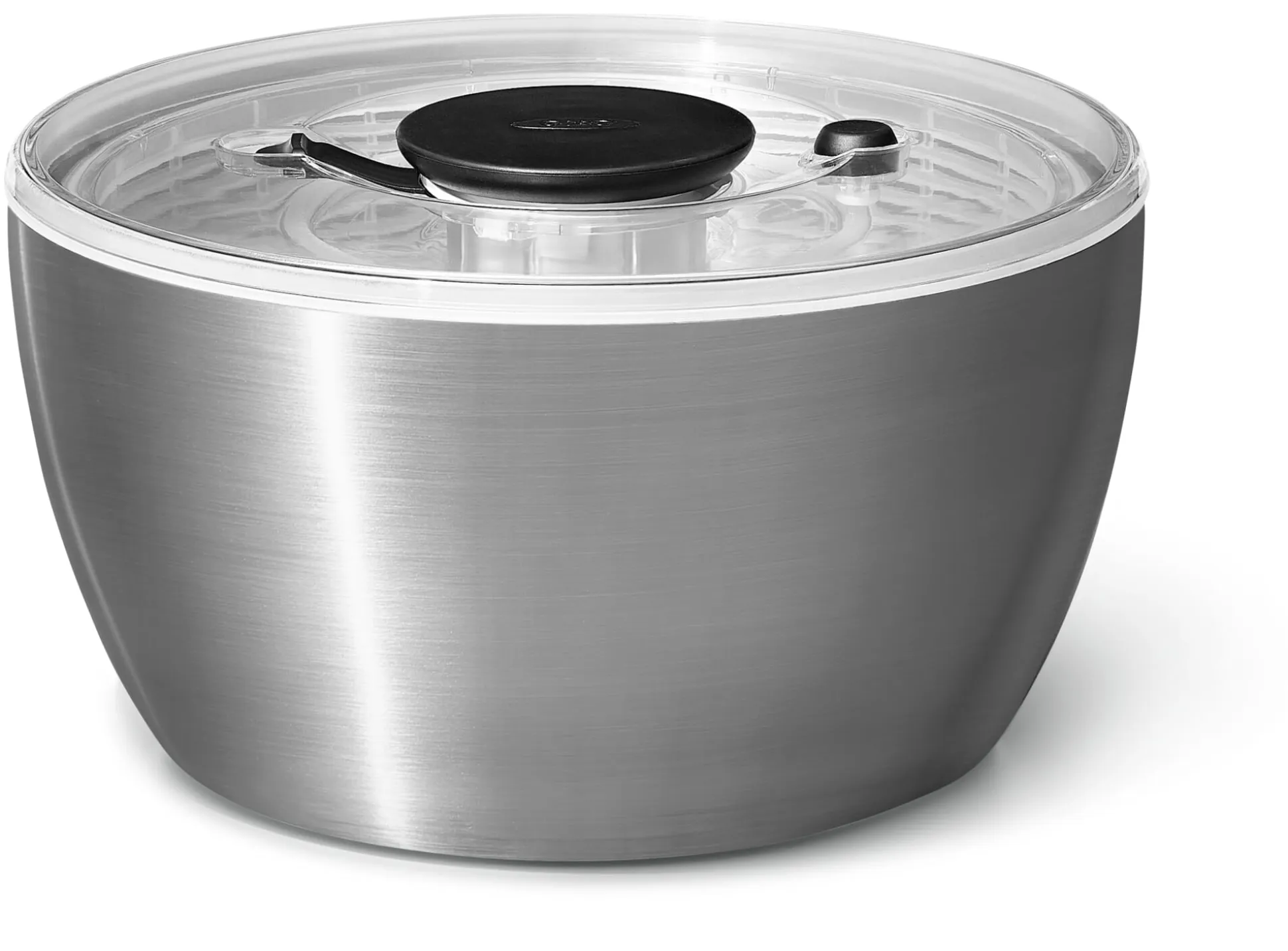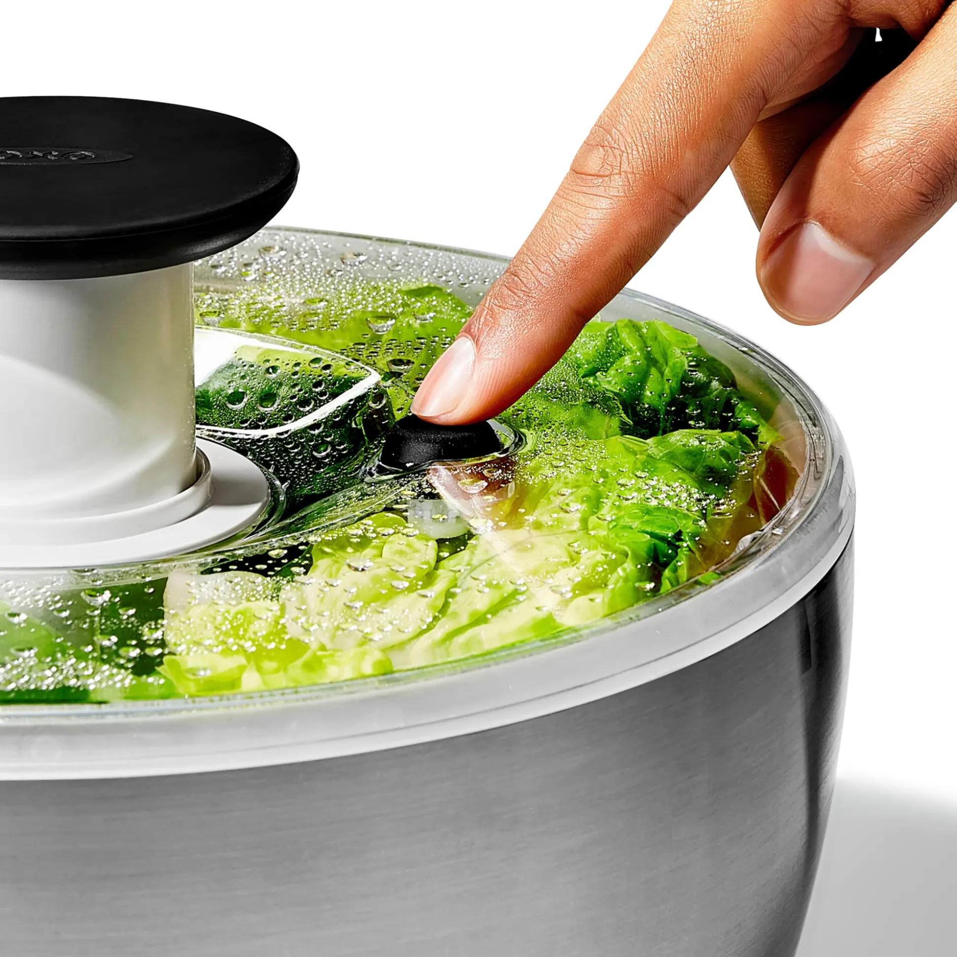 Große Salatschleuder mit Glas- oder Edelstahlschüssel: ROTOR 2.0 ist ausgestattet mit einem patentierten Pumpmechanismus – der Innenbehälter wird durch Drücken des Softgrip-Knopfs in Rotation versetzt. Die patentierte Bremse stoppt den Korb sofort mit einem einfachen Druck. Mühelos mit einer Hand zu bedienen und als Arbeitsgerät wie als Servierschüssel gleichermaßen nutzbar. Der zentral sitzende Knopf der Mechanik wird in der unteren Position zum platzsparenden Verstauen verriegelt. Der transparente Deckel lässt sich zum einfachen Reinigen demontieren. Für die Spülmaschine geeignet.