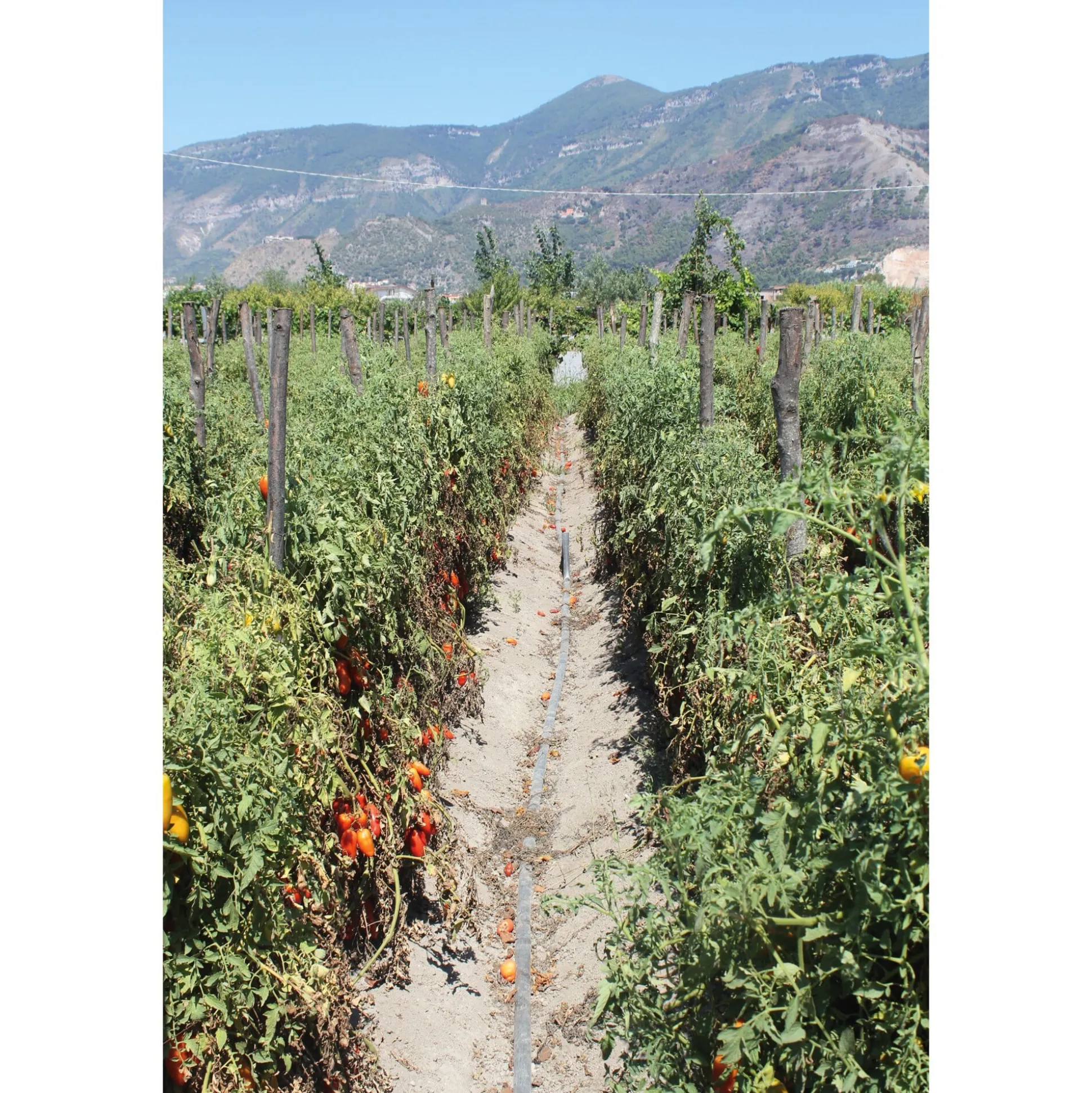 Wer im Spätsommer in die Kleinstadt San Marzano sul Sarno am Fuße des Vesuvs kommt, der nimmt neben der Hitze auch die feuchte, dichte Luft wahr, die von unverkennbaren Aromen gekochter Tomaten durchzogen ist. Verarbeitet wird in den dortigen Produktionsstätten die nach der Stadt benannte San-Marzano-Tomate, die in Schüben reift und sieben bis acht Mal von Juli bis September geerntet wird. Noch in der Dose drückt sich ihre höhere Art aus: die ganzen Früchte haben immer noch beträchtlichen Biss, der eigene Saft schmeckt wie die Essenz der Tomate. Wir beziehen sie von Giuseppe Napoletano, der mit 40 Kleinbauern zusammenarbeitet, die auf den fruchtbaren, vulkanischen Böden im Umkreis seines Betriebs die Tomaten anbauen.