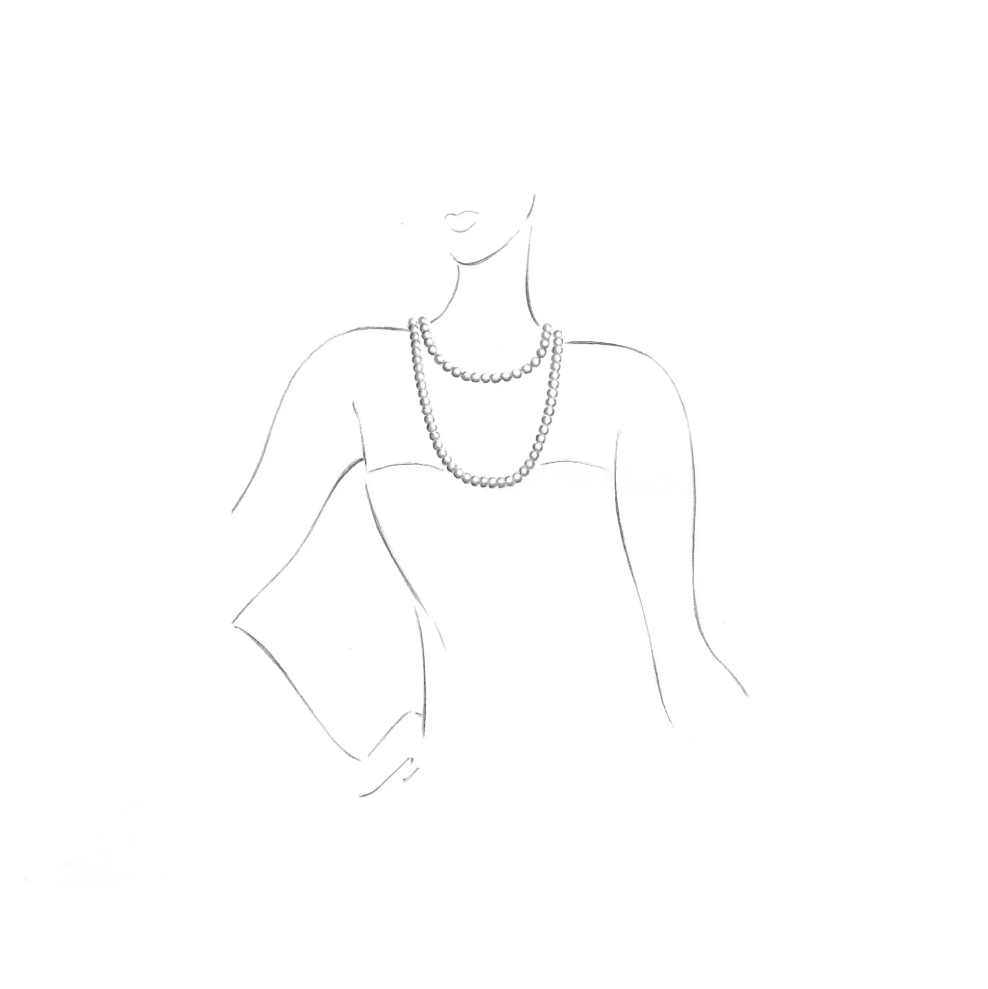 Süßwasser-Zuchtperlen, Ø 6,5–7 mm. Schließe aus zwei massiven, mattierten Silberringen (925er Silber). Länge 125 cm. Gewicht 82 g.