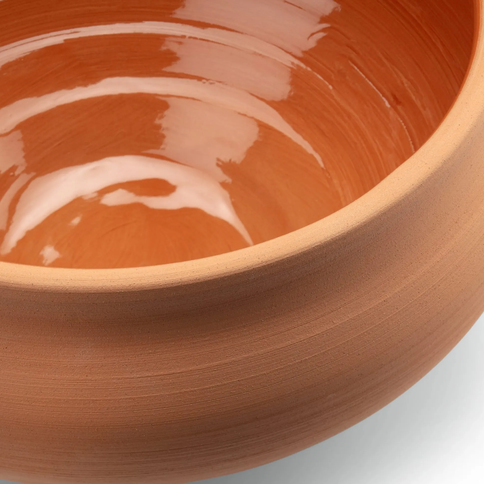 „Belle“ nennt Bergs Potter diese Kollektion, und die „Schöne“ vertritt ihren Namen mit der natürlichen Anmut organischer Formen – passend zur Handfertigung an der Töpferscheibe, die jede Schale als Unikat auszeichnet. Auf der Keramikoberfläche hinterlässt das Drehen auf der Töpferscheibe die feinen Spuren, welche die Schale elegant umziehen, so charakteristisch wie die Jahresringe eines Baumes. Aus Majolika-Ton getöpfert, wird das Innere der Schale nach dem Schrühbrand – dem ersten Brand bei moderater Temperatur – mit einer transparenten, lebensmittelechten Glasur anstelle der klassischen opaken Zinnglasur versehen, bevor der Scherben ein zweites Mal gebrannt wird. Außen naturfarben und unglasiert, verfügen die Schalen dank der Innenglasur über eine wasserundurchlässige Innenseite. Neben Utensilien oder Filzblumen können Sie darin also ebenso ansprechend den täglichen Apfel deponieren oder frische Schnittblumen arrangieren.