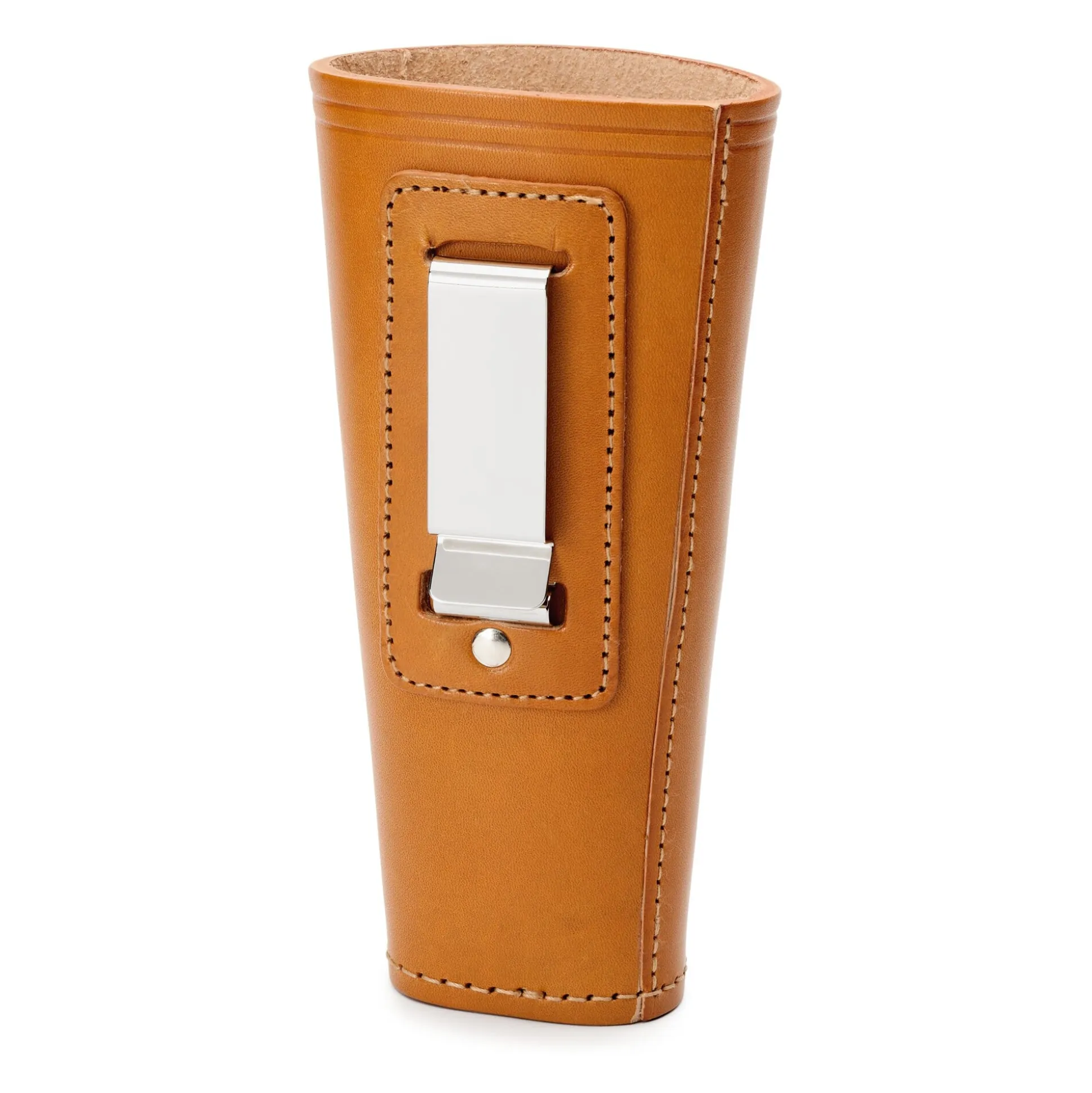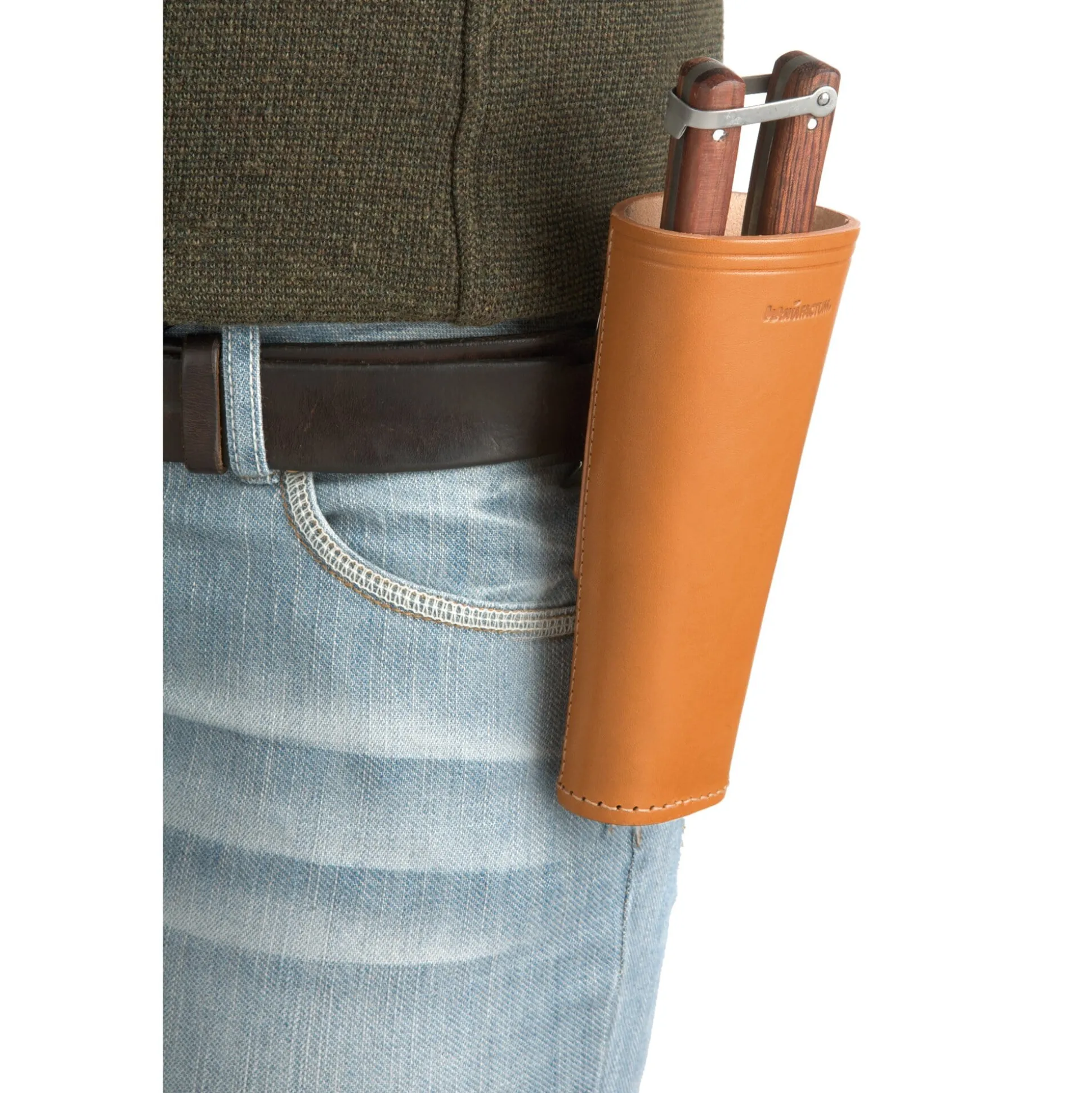 Der feste, geschlossene Boden dieses Scherenköchers ist mit einer stabilen Kantennaht befestigt; die Gartenschere schaut also nicht – wie oft üblich – mit der Spitze unten heraus. Der Köcher nimmt auch Klappsägen, Messer, Schraubendreher und anderes Kleinwerkzeug auf; er wird mit einer Stahlklammer am Gürtel befestigt und kann so mit einem Griff angeklemmt und wieder abgenommen werden.