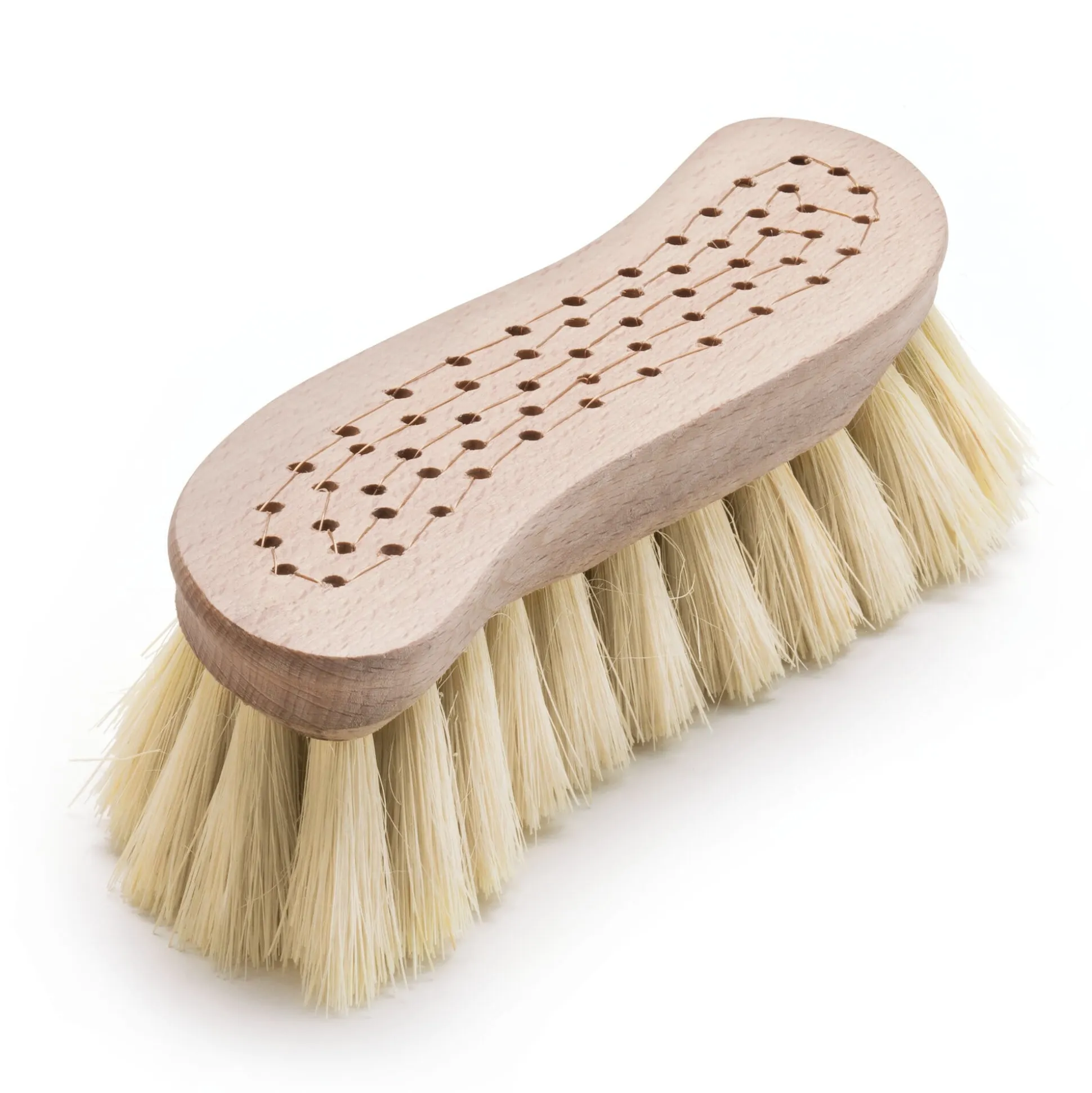 Die Scheuerbürste wird in Handarbeit in einer Brandenburger Blindenwerkstatt hergestellt. Der Bürstenkörper besteht aus heimischem Buchenholz, die Borsten werden aufwendig von Hand Bündel für Bündel eingezogen – dies zeigt sich am sichtbaren Kupferdraht, der die Borsten fest zusammenhält und dauerhaft mit dem Holzkorpus verbindet.