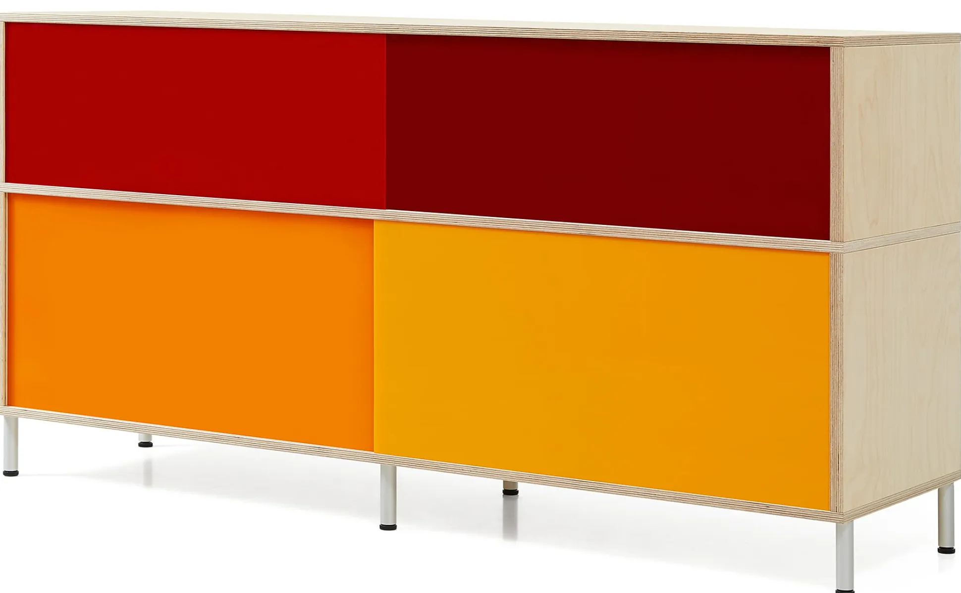 Satz von vier Schiebetüren in den Farben Dunkelrot, Rot, Orange und Hellorange oder in einem neutralen, fast lichtundurchlässigen Weißton zum Einsatz im Sideboard IRION HOCH. Die Schieber werden werkzeugfrei in die Führungsschienen des Korpus eingesetzt.