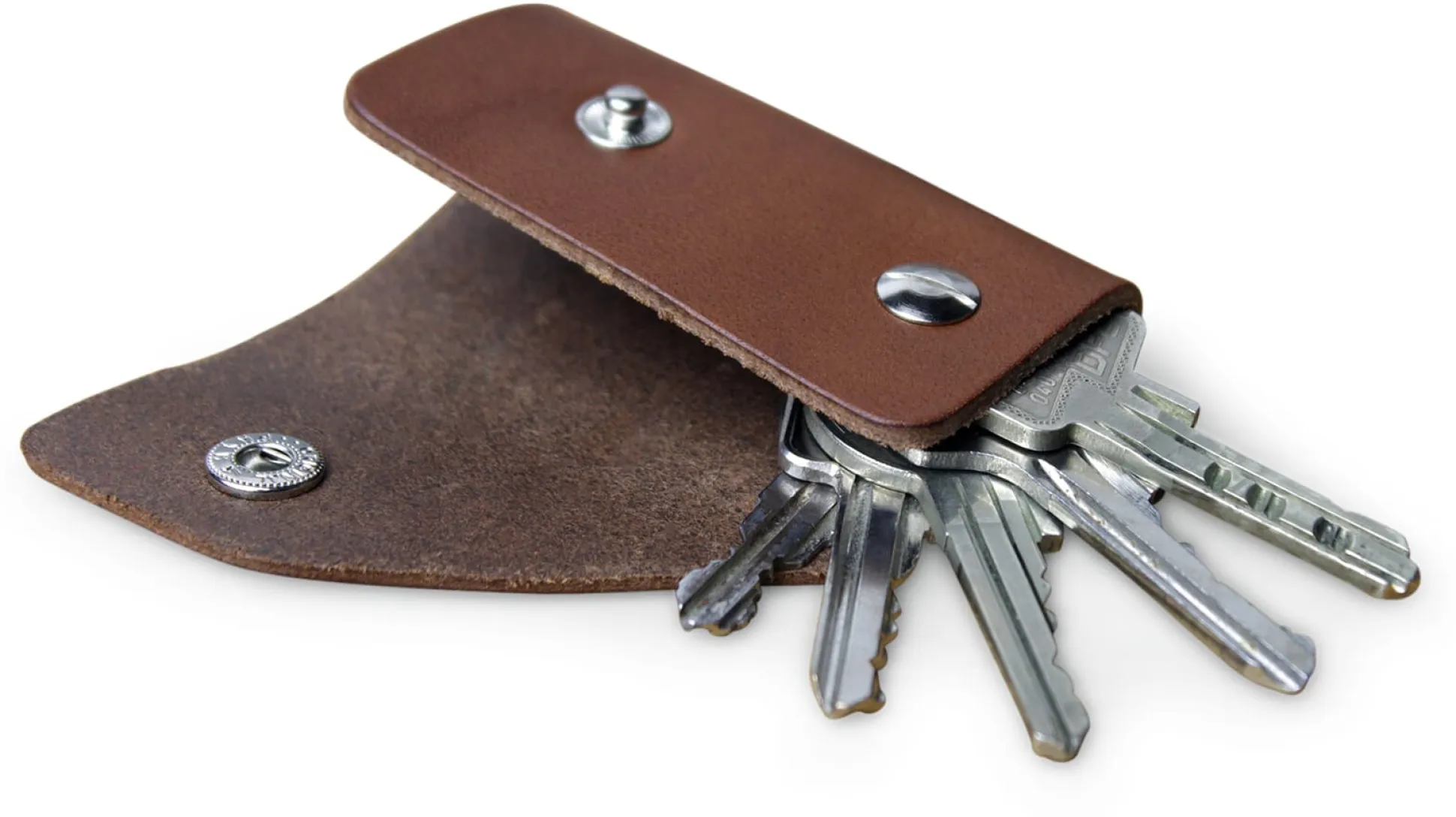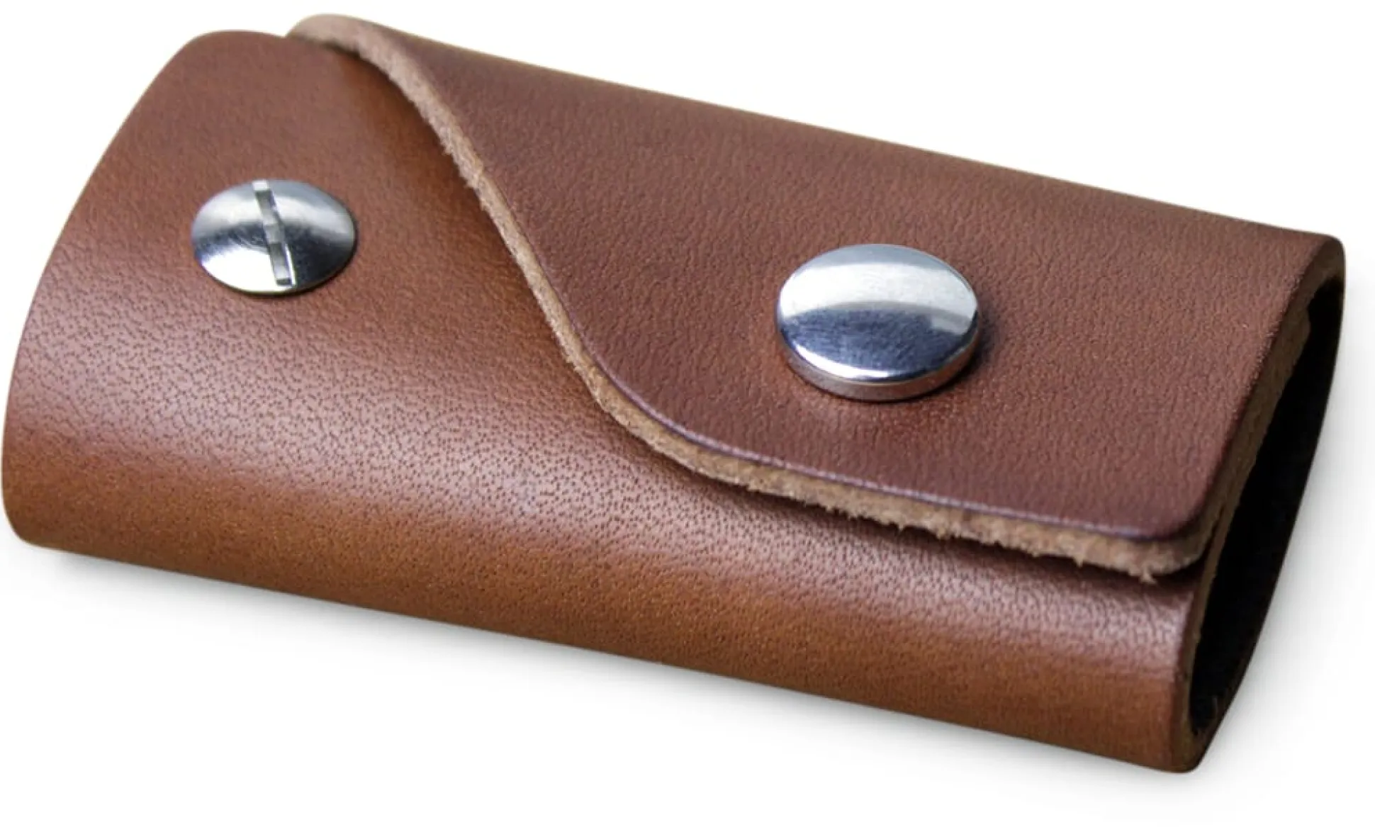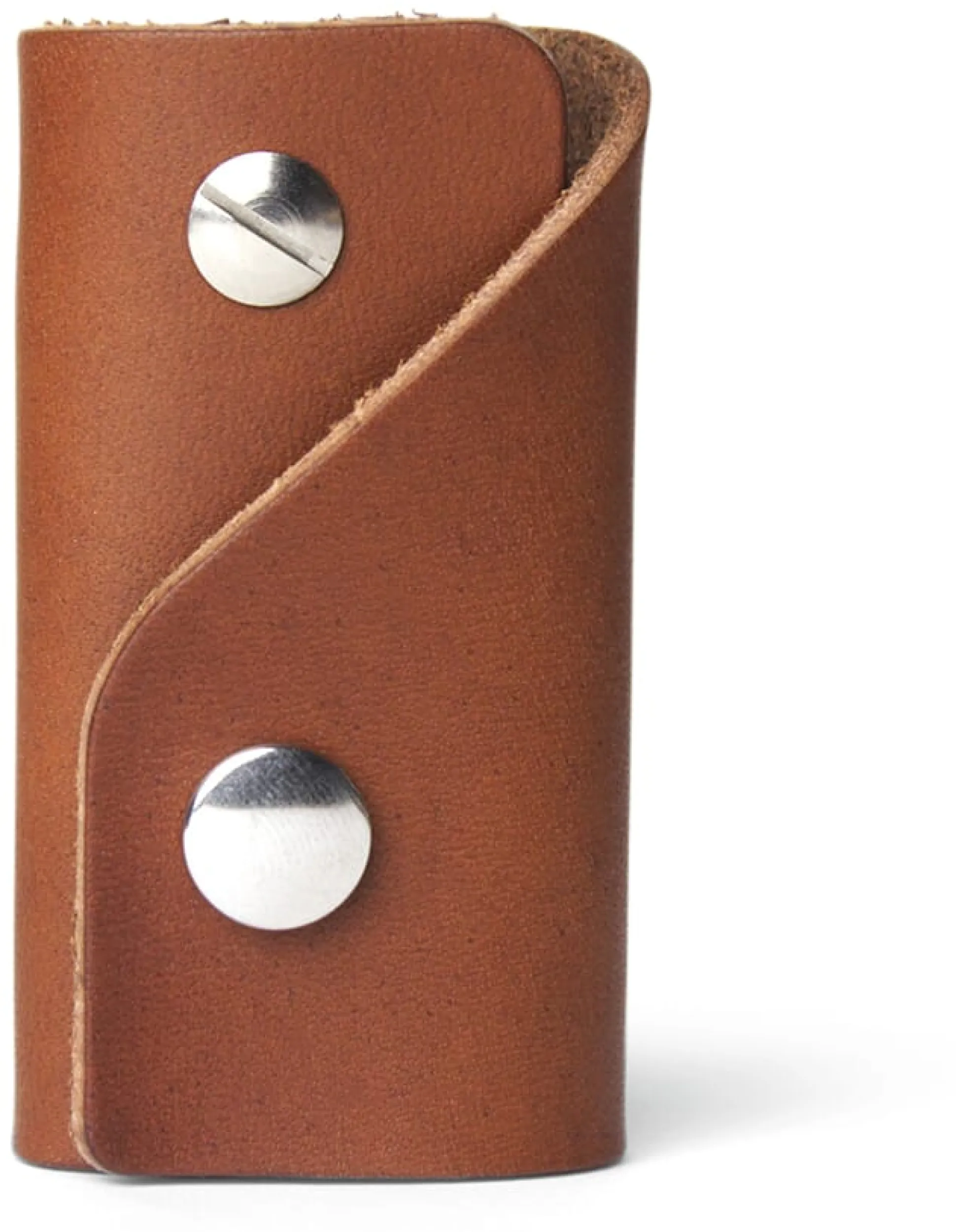 Zusammenfassend schön: Das kompakte Schlüsseletui für bis zu 5 Schlüssel verwandelt den unförmigen Schlüsselbund in ein geordnetes, kleines Paket. Eine Buchbinderschrauber nimmt Schlüssel ab einem Lochdurchmesser von 4 mm auf und sichert sie im Inneren des Lederumschlags. Dessen Leder kommt aus der Toskana und ist zu 100% pflanzlich gegerbt.