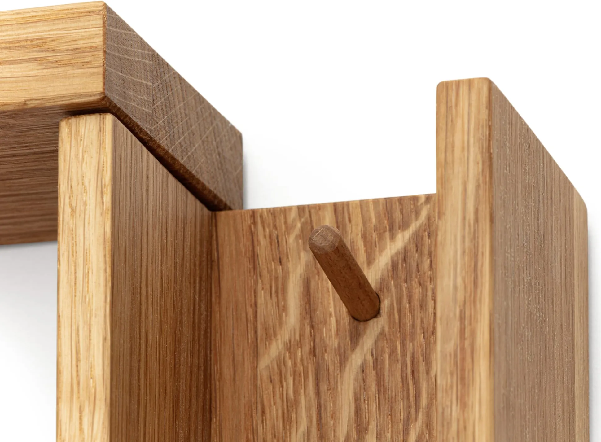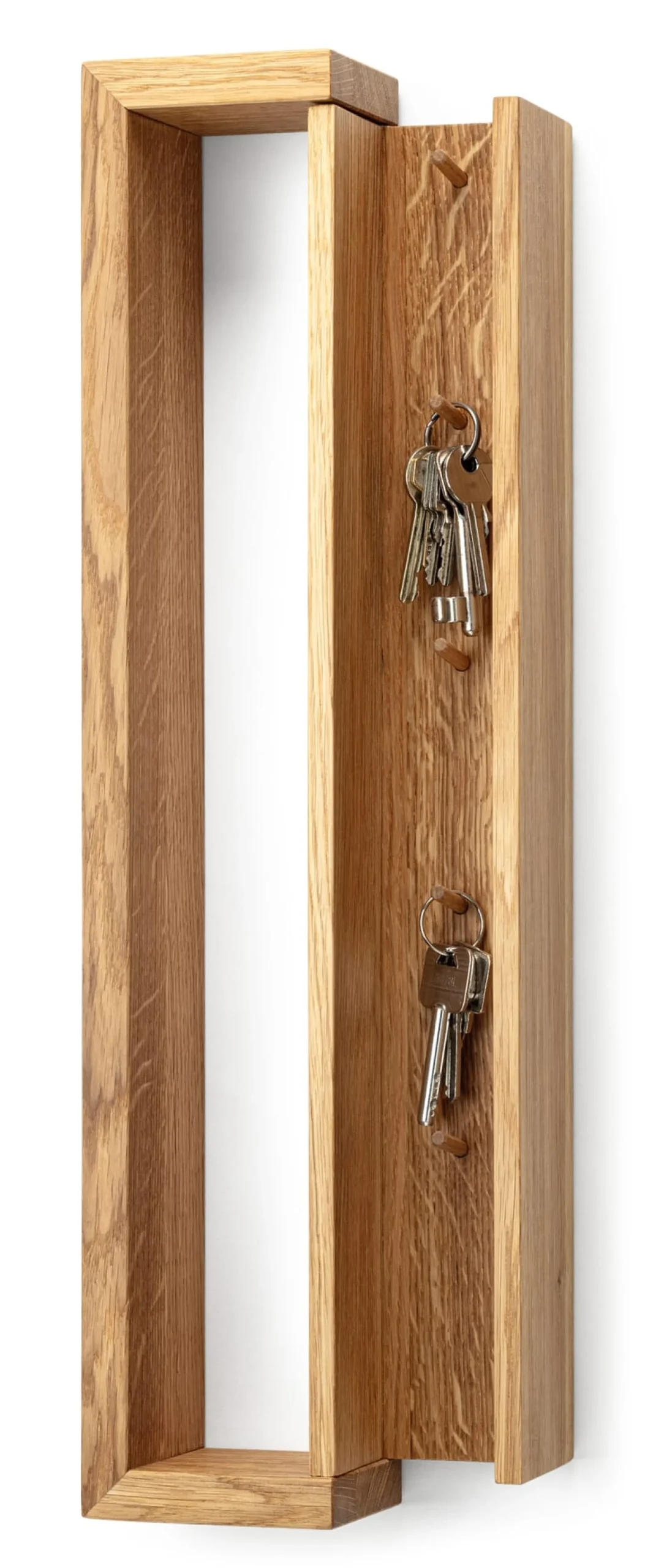 Eichenholz geölt (Herkunft Deutschland). Rückseitig mit zwei Schlüsselloch-Aufhängern. Breite 8 cm, Höhe 53 cm, Tiefe 10 cm (auseinandergezogen Tiefe 8 cm). Gewicht 1,6 kg. Befestigungsmaterial liegt bei.