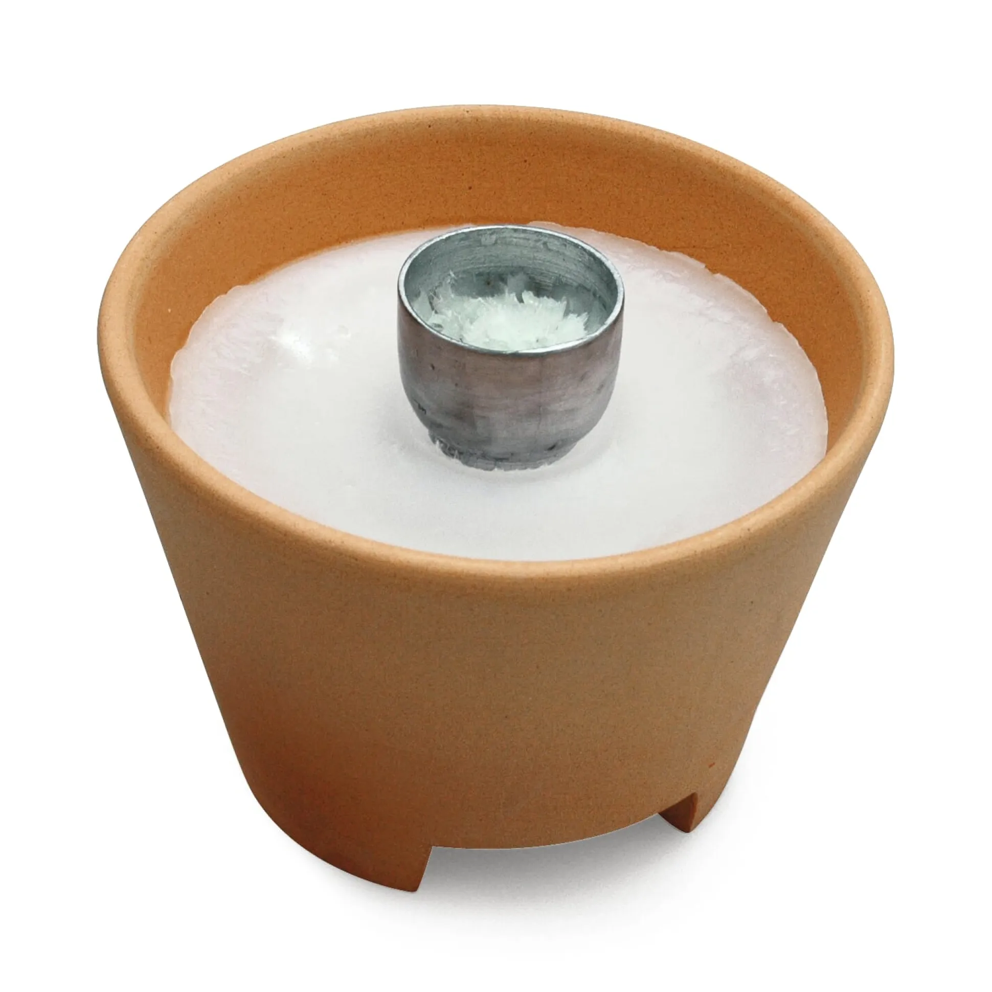 Vollkeramik, Aluminiumbrenner; Ewigdochte aus Glasfaser, metallumwickelt. Nachfüllbar. Topf frostfest, witterungs- und farbbeständig. Die auf der Unterseite eingearbeiteten Füße sorgen für gute Belüftung, eine Wärmeeinwirkung auf empfindliche Standflächen kann ausgeschlossen werden. Mit 100 g Wachs, Brenndauer ca. 12 h. Lieferung ohne Deckel.