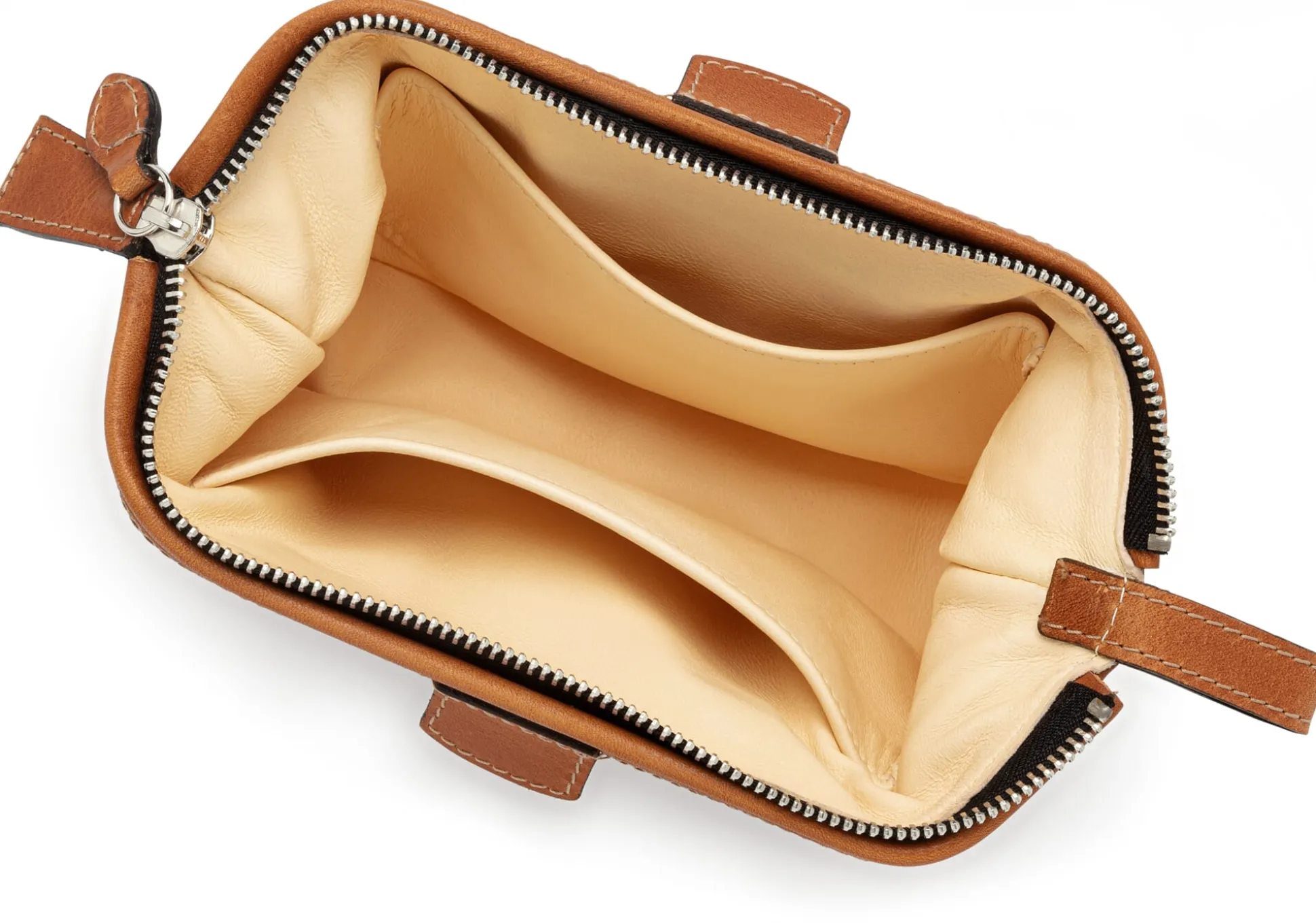 Der Korpus ist mit sauber eingeschlagenen Kanten gearbeitet, offene Lederkanten sind sorgfältig glattgezogen, gefärbt und gewachst, Lederbesätze schützen die Ecken. Innen ist die Schminktasche mit weichem, naturfarbenem Schafleder ausgeschlagen, das auch für die beiden an den Seiten eingearbeiteten Steckfächer verwendet wird. Der extrem robuste, breite Reißverschluss – ebenfalls selten bei Schminktaschen – kommt aus Italien, von einer Firma, die sonst Komponenten für militärische und geologische Ausrüster fertigt. Polierte Zähnchen sorgen dafür, dass er sehr leichtgängig ist.