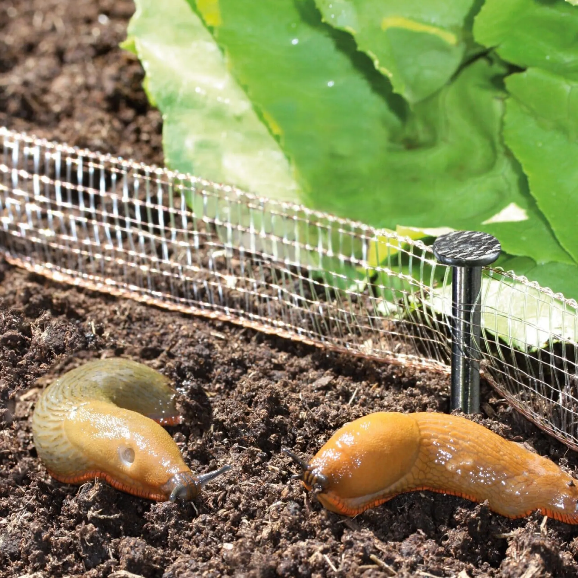 Dieser filigrane Schneckenzaun besteht aus einem gewebten Kupferband, mit dem bis zu 20 qm große Flächen eingezäunt werden können, ohne dass eine bestimmte Form vorgegeben wäre: Denn das Band ist flexibel. Um den Zaun aufzustellen, werden die beiliegenden Erdnägel ähnlich wie kleine Pfosten durch ein oder zwei Maschen in dem Band geführt und in die Erde gesteckt. In Pflanzkübeln lässt es sich auch entlang des Gefäßrandes aufspannen.