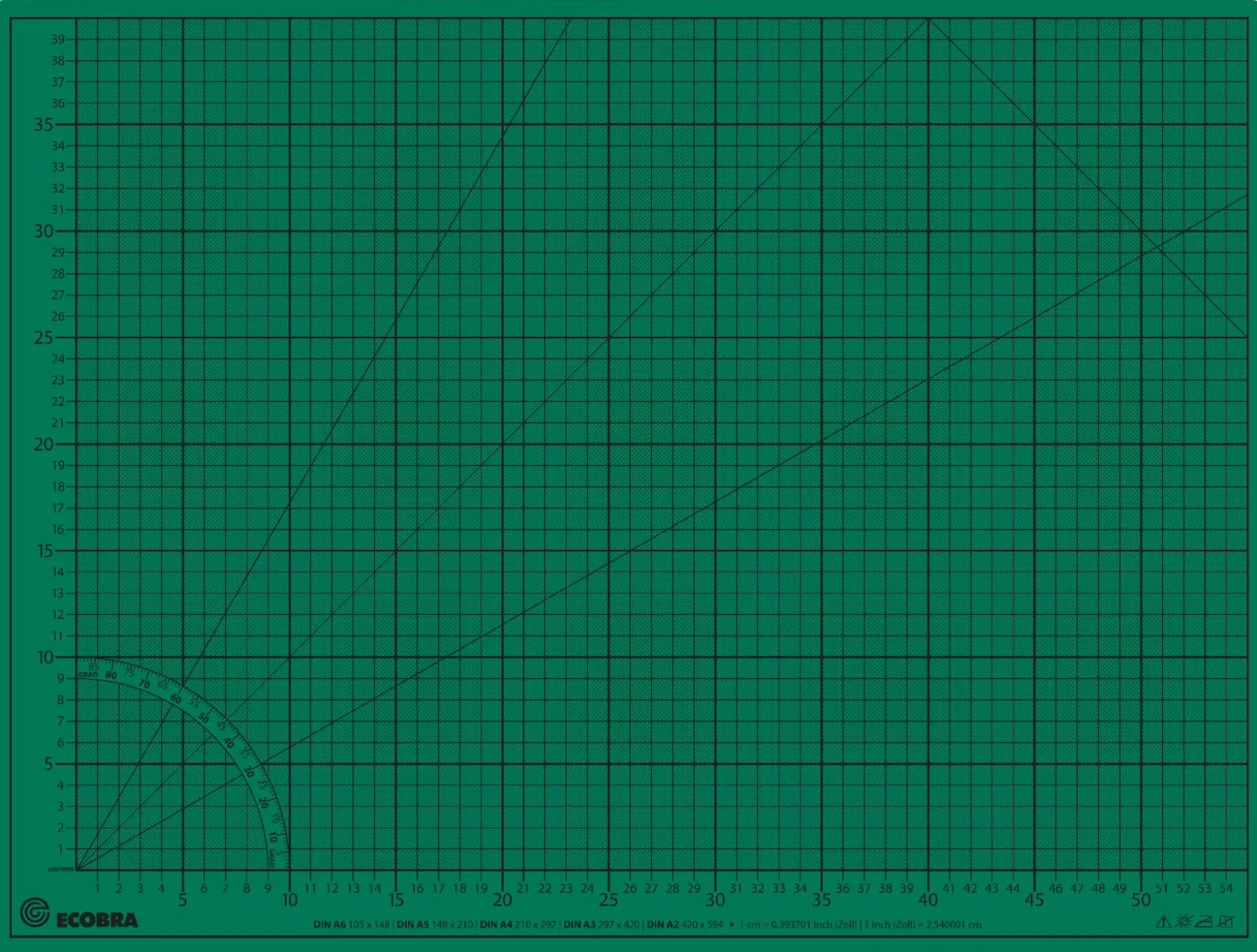 Gleichzeitig komfortabler weicher Schreibgrund und unempfindliche Basis für Schneidearbeiten: Auf der grünen Oberseite bedruckt mit 10- und 50 mm Teilung und unterlegtem Raster – umseitig uni schwarz und unbedruckt. 5-lagige „Sandwich-Soft“ Bauweise mit hartem Kern.