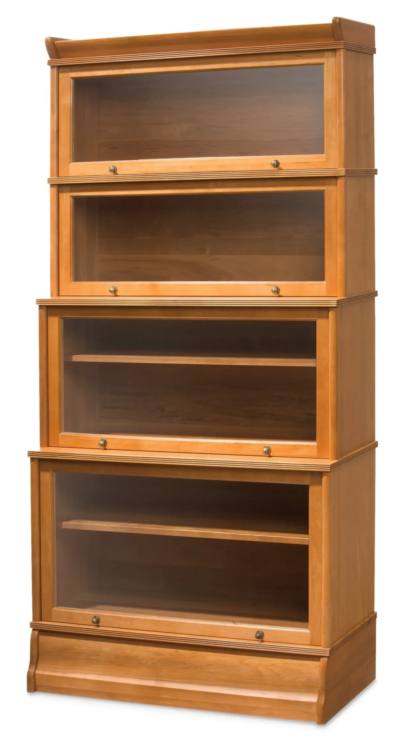 Ein Schrank im klassischen zurückspringenden Aufbau mit Hochsockel, 4 Schrankelementen mit Klarglasfront und abschließendem Kranz. B 880 x H 1837 x T 434 mm. Gewicht 63 kg. Lieferung ohne Dekoration.