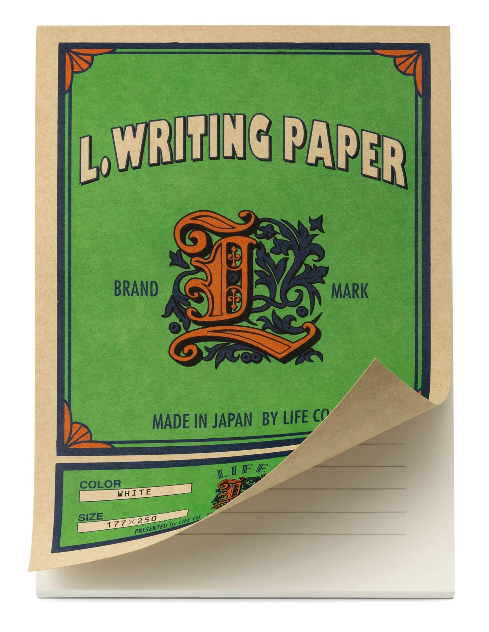 70 Blatt, liniert (10 mm), mittig gesetzte Lineatur. Zartweißes 85-g-Papier. 25 × 17,5 cm. Klebebindung, Schweizer Broschur. Aus Japan.