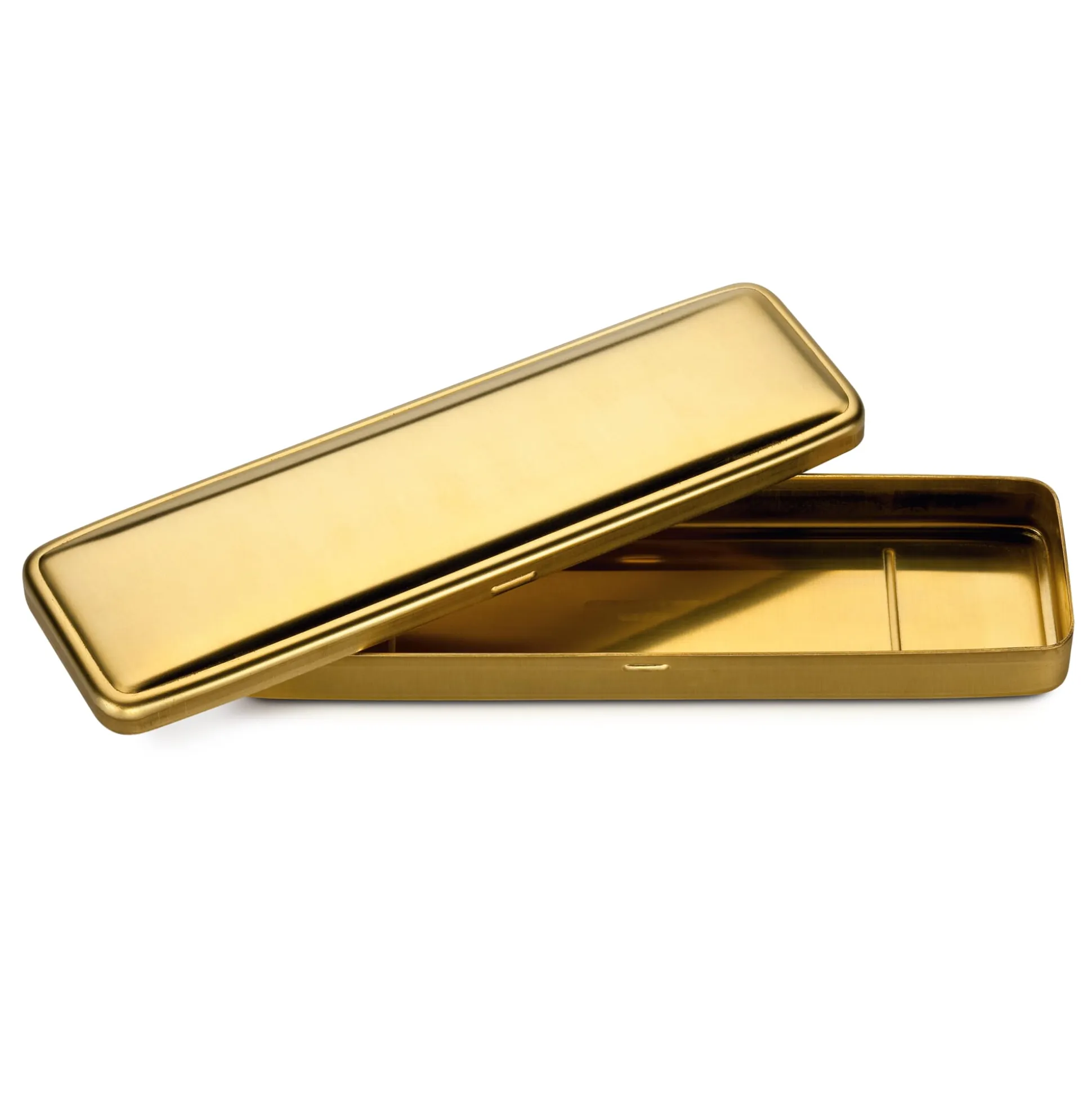 Dieses zweiteilige, ordentlich schwere Stülpdeckeletui aus Messing ist ganz auf den Schutz seines Inhalts und eine lange Lebensdauer ausgelegt. Der äußeren Form nach erinnert es an die metallenen Zubehörkästchen, wie sie früher zumeist mit der Nähmaschine ins Haus kamen und in denen man aufbewahrte, was zum Nähen gebraucht wurde (Nadeln, Garnrollen, Nähmaß). In unserem Etui lässt sich also aufbewahren, was an Schreibwerkzeug (zum Schreiben mit der Hand) benötigt wird.