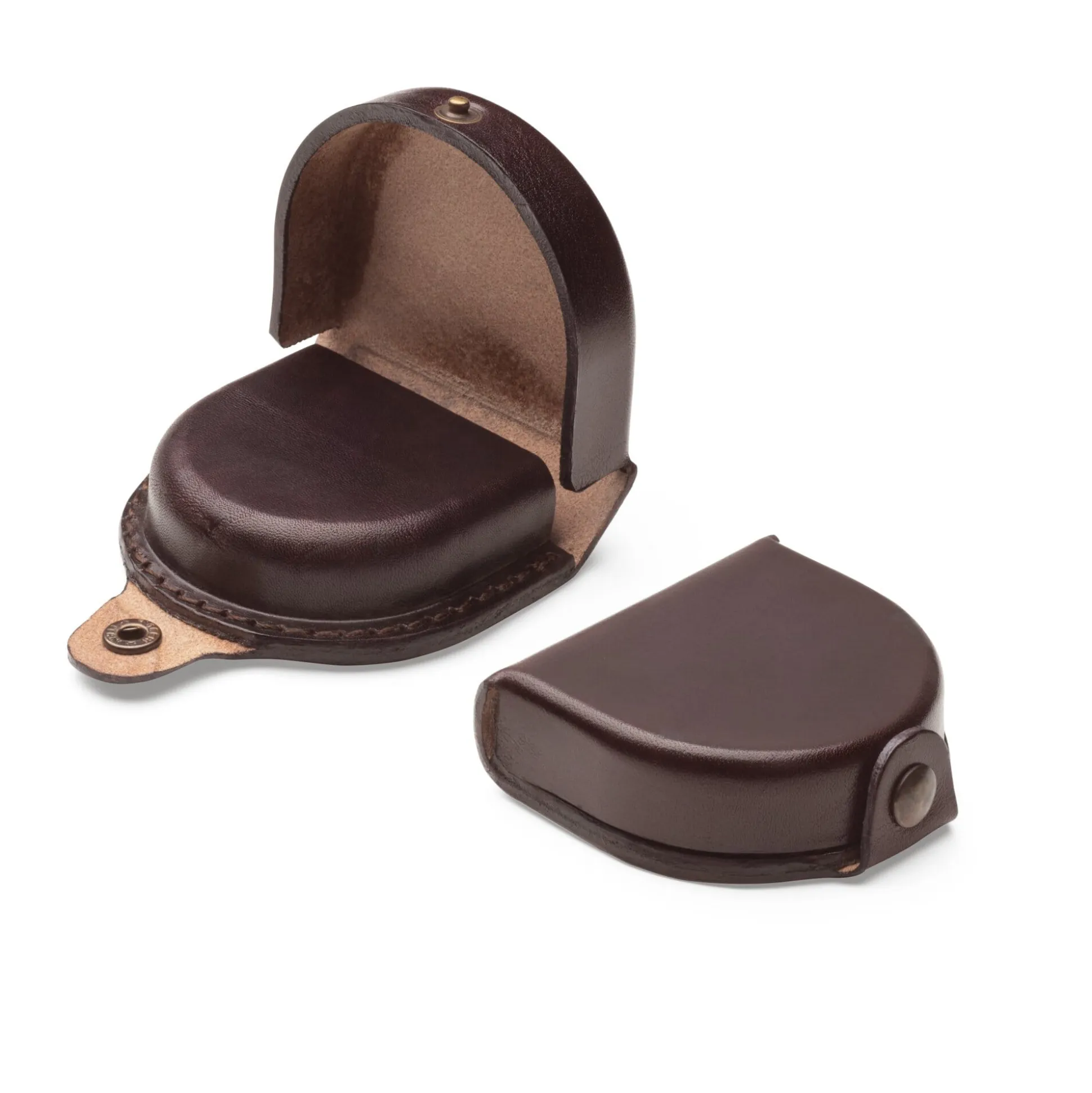 Rindleder, vegetabil gegerbt (Stärke des Rahmens 3,6 mm, des Bodens 2,4 mm), offenkantig in Sattlertechnik vernäht. Druckknopfverschluss. Hergestellt in Ungarn.