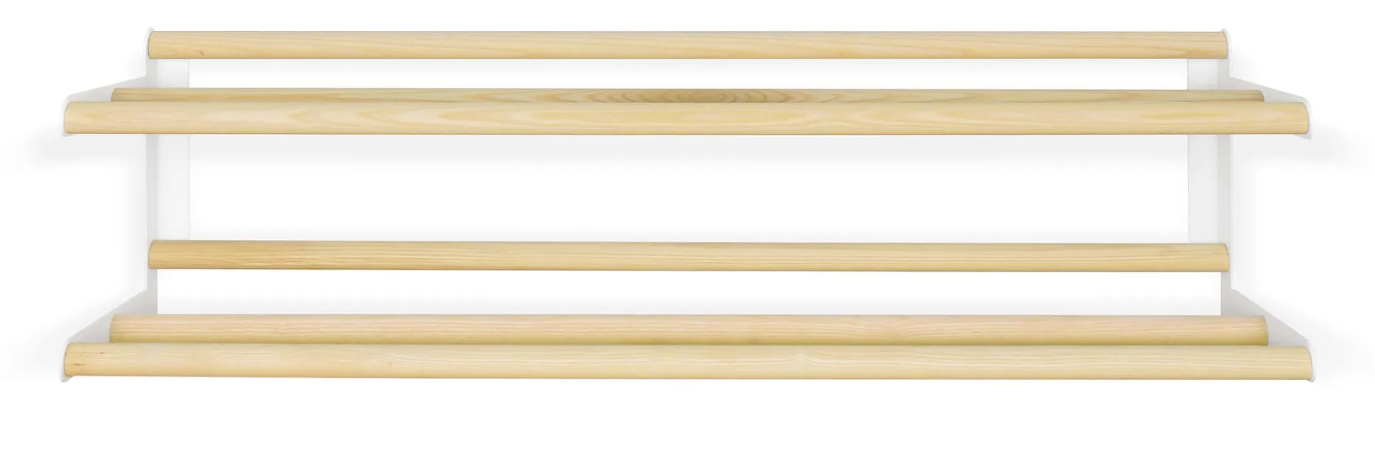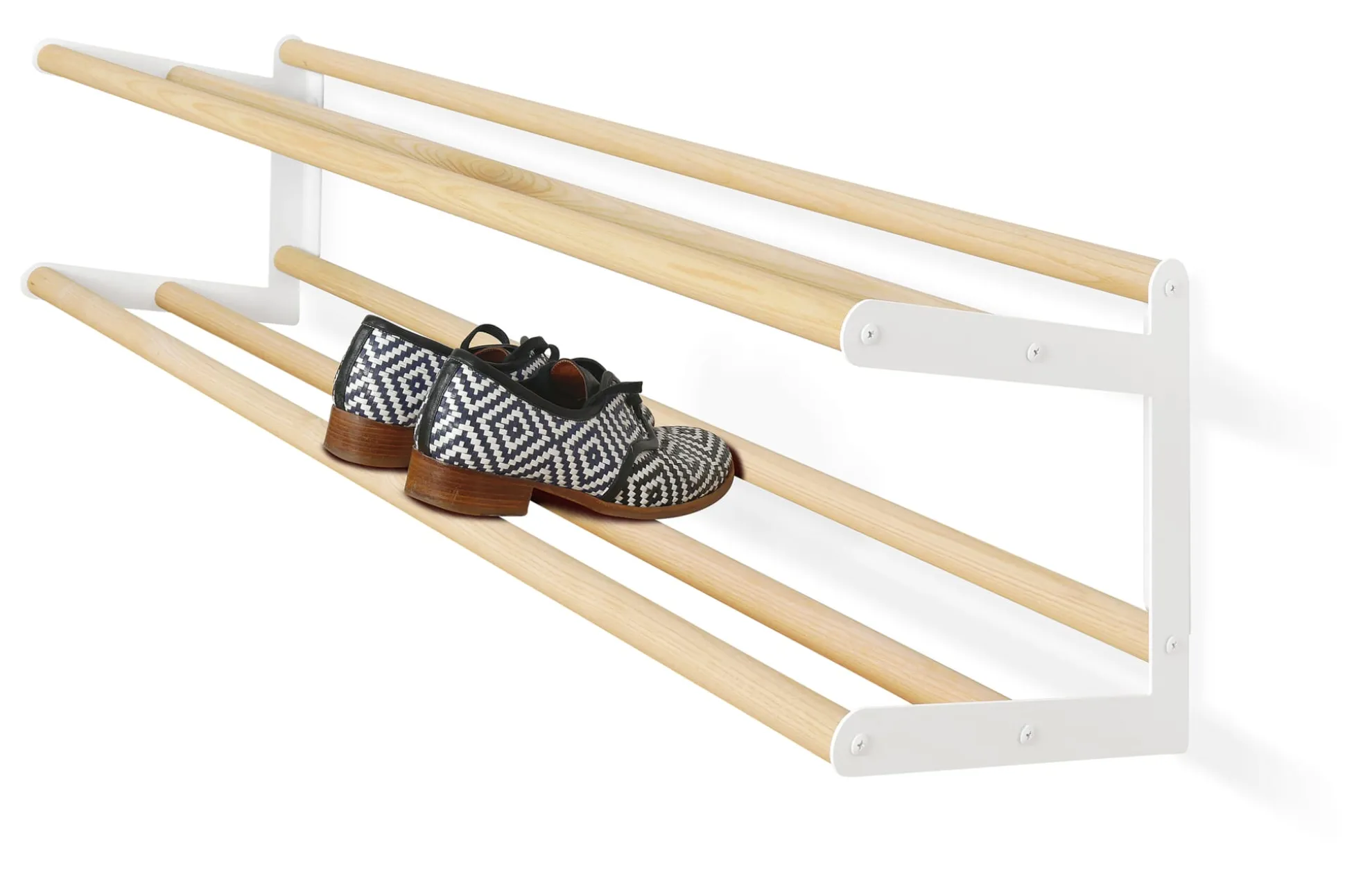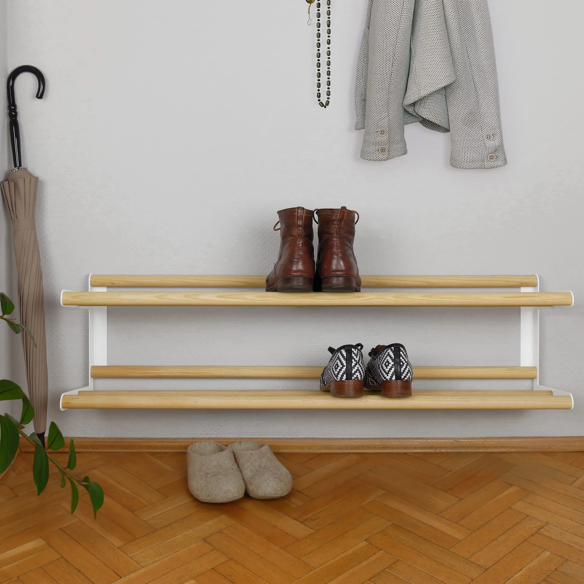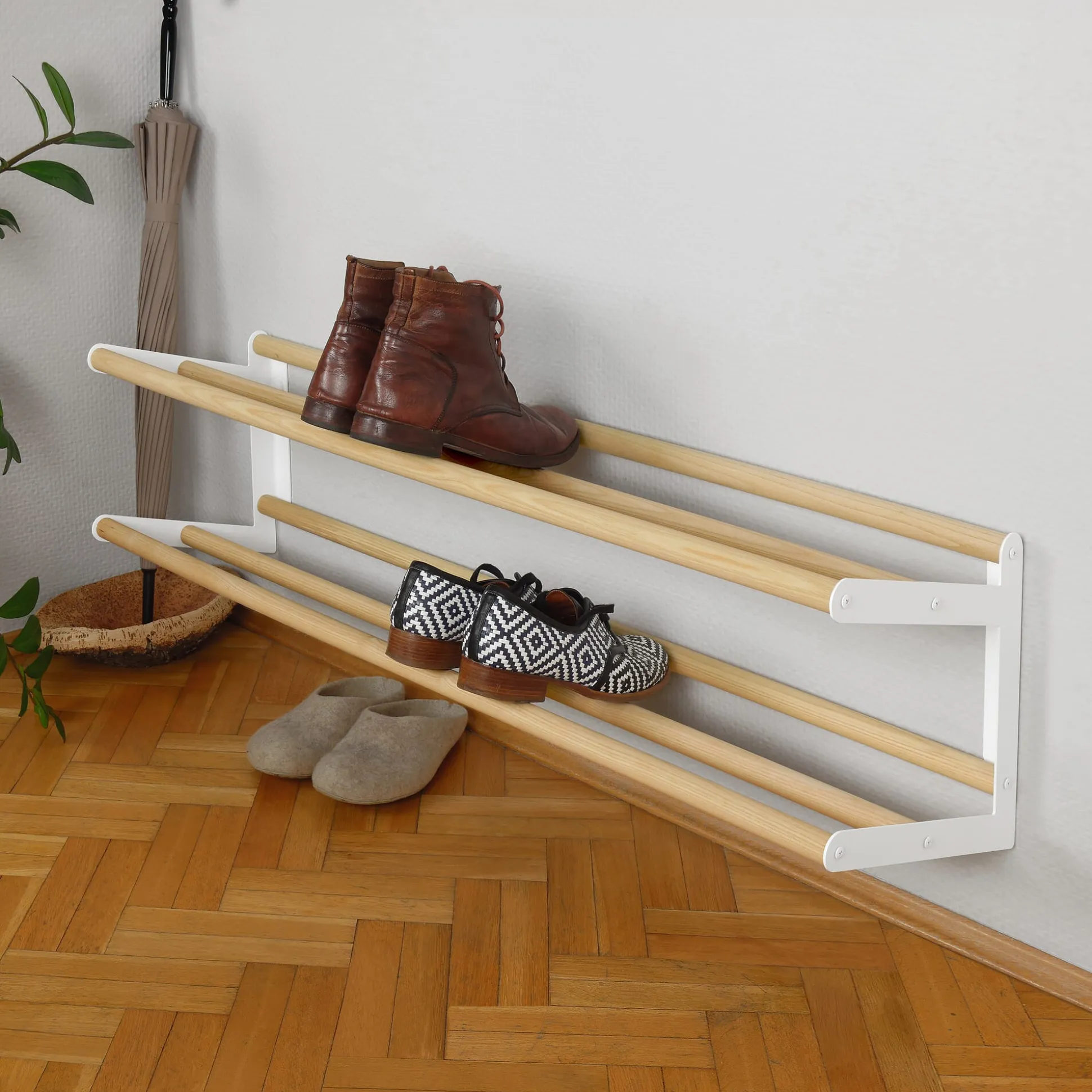 Das Schuhregal STIXX zur Wandmontage. Gefertigt aus Eschenholzstäben und Verbindungselementen aus Stahlblech, trägt das demontiert gelieferte und mit wenig Aufwand zu montierende Regal bis zu vier Paar Damen- wie Herrenschuhe je Stangenpaar. Das Zubehör zur Wandmontage gehört zum Lieferumfang.