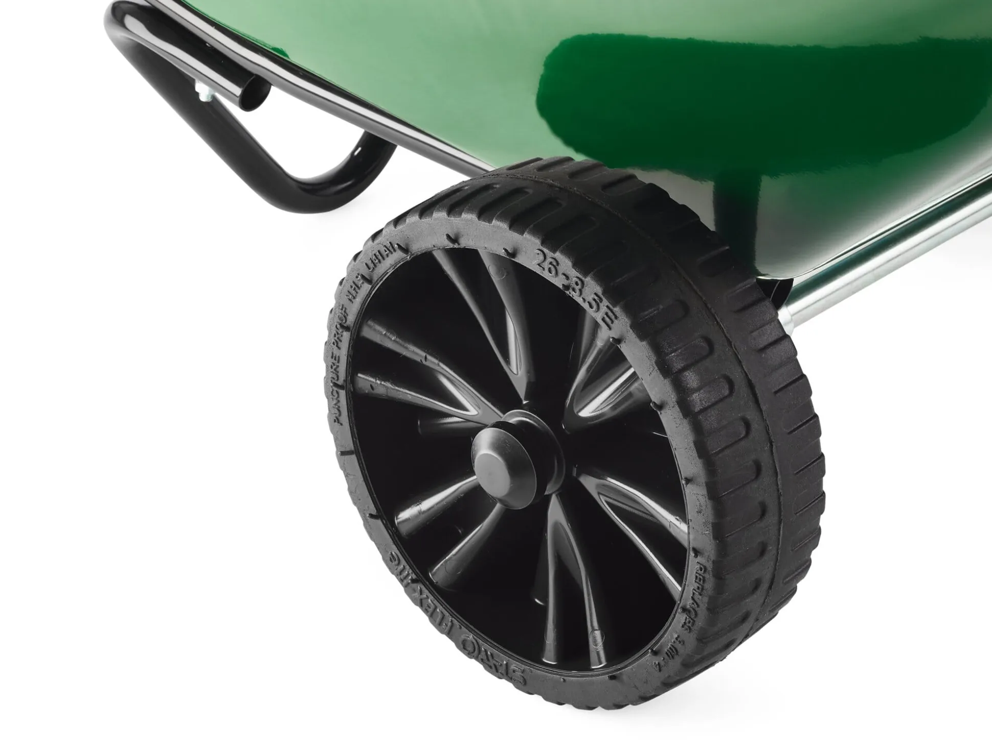 Gestell, Wanne und Achse Baustahl pulverbeschichtet. Felgen aus Polypropylen-Copolymer, Reifen aus Polyether. Volumen 90 l. Höhe 49 cm, Länge 142 cm, Breite 66,5 cm. Ø Rad 25 cm. Gewicht 13 kg. Lieferung zerlegt; mit Aufbauanleitung.