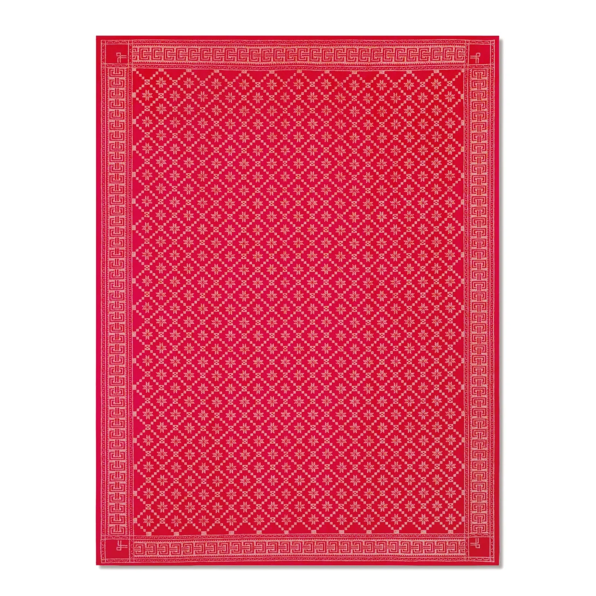 Die rote weihnachtliche Tischwäsche hat eine lange Tradition, das jacquardgewebte, typisch skandinavische Sternenmuster ist wohl mehr als 200 Jahre alt und wird bei Ekelund seit vielen Jahrzehnten gewebt. Die Kette in einem kräftigen Rot bestimmt den Grundton, die kontrastreichen Muster entstehen durch das ungefärbte Leinengarn im Schuss. Die Tischdecke ist in Halbleinenqualität gefertigt, sie ist robust, strapazierbar und formbeständig. Die Kette ist aus Baumwollzwirn (Garnfeinheit Nm 20/2), der Schuss aus Leinen (Garnfeinheit Nm 30). Die Leinengarne bezieht Ekelund aus Frankreich und Belgien, zwei Ländern, aus denen beste Flachsqualitäten kommen.