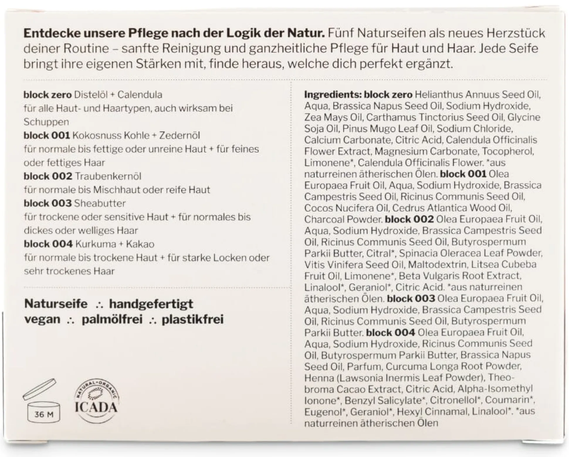 BLOCK 001 Inhaltsstoffe: OLEA EUROPEA FRUIT OIL, BRASSICA CAMPESTRIS SEED OIL, RICINUS COMMUNIS SEED OIL, COCOS NUCIFERA OIL, CEDRUS ATLANTICA WOOD OIL, CHARCOAL POWDER