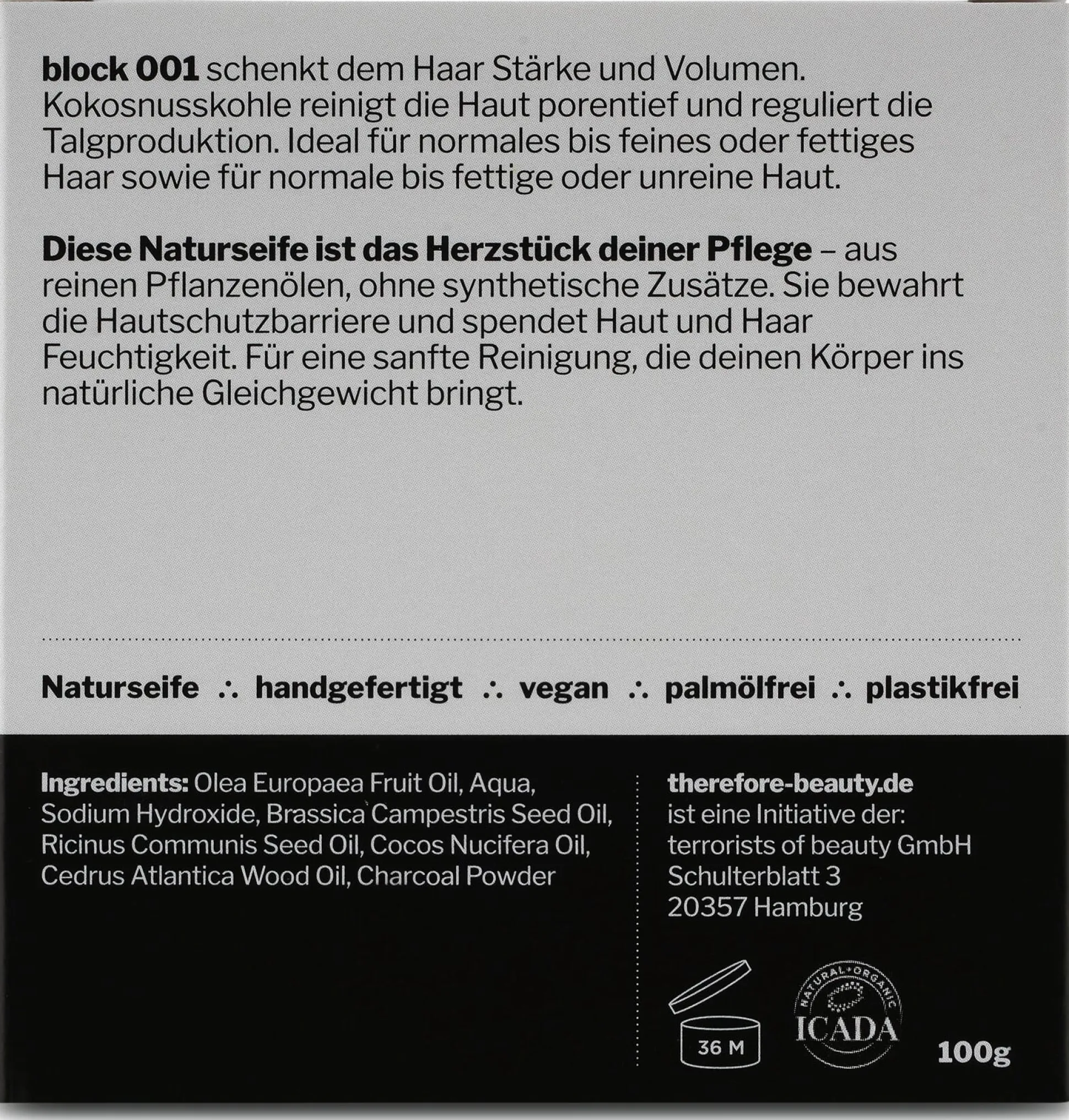 Block 001 schenkt dem Haar mit der Kraft von Zedernöl Stärke und Volumen. Die Kokosnusskohle reinigt die Haut porentief und reguliert die Talgproduktion.