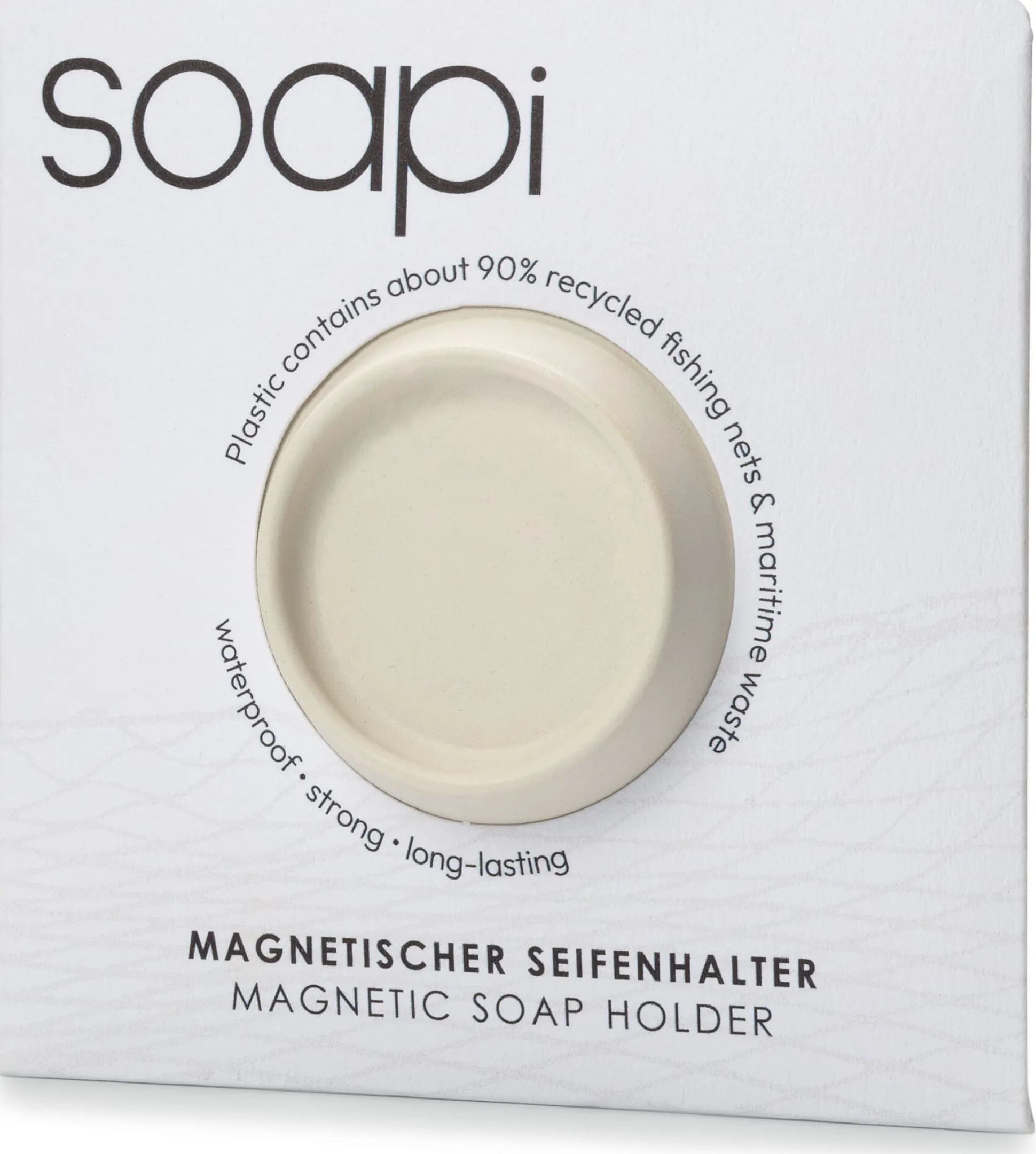 Aus recyceltem Kunststoff. Mit einem Neodym-Magneten (FairMagnet-zertifiziert) und Klebestreifen. Ø 5 cm, Höhe 1 cm. Gewicht 11 g. Lieferung ohne Seife und Kronkorken.