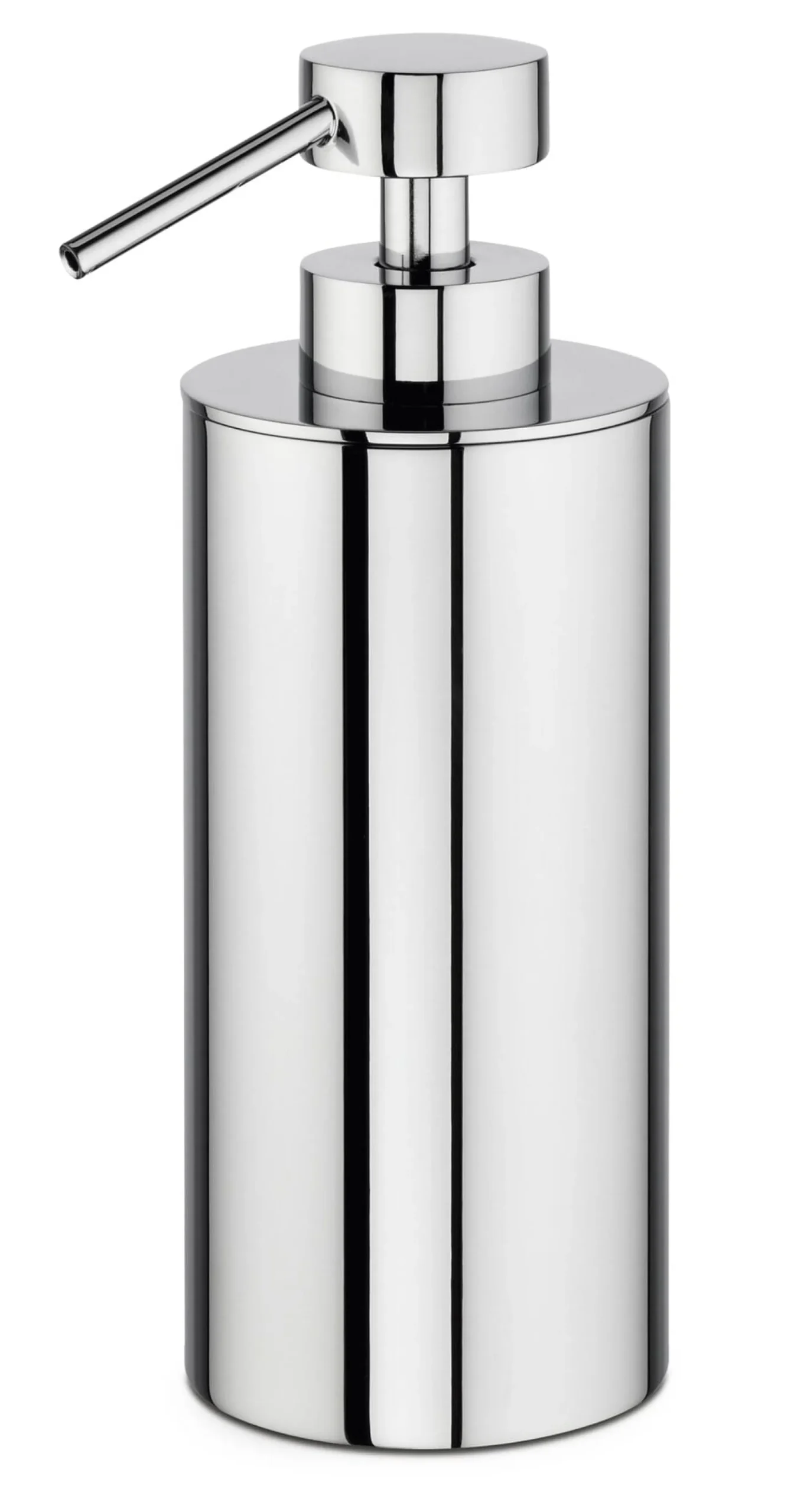 Seifenspender und Pumpe aus verchromtem Messing. Seifentank aus Pressglas, klar. Saugschlauch aus Kunststoff. Volumen 140 ml. Höhe 16 cm, Ø 6 cm. Gewicht 590 g. Lieferung ohne Seife.