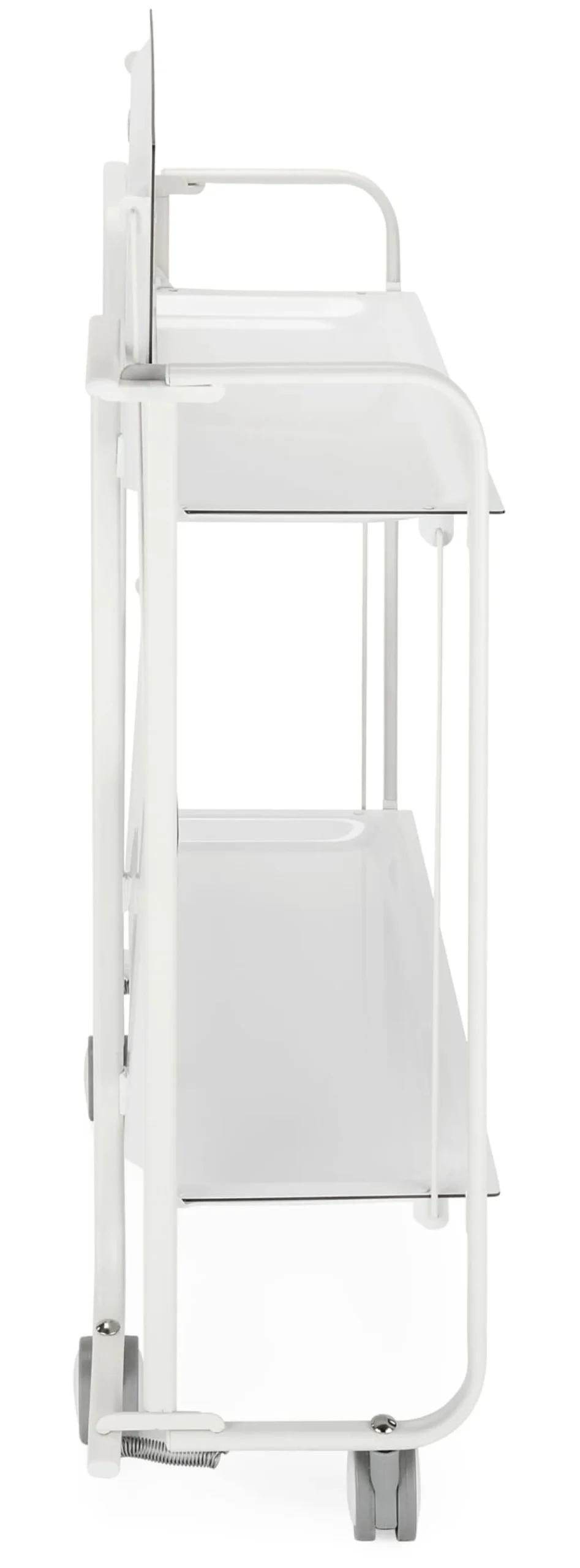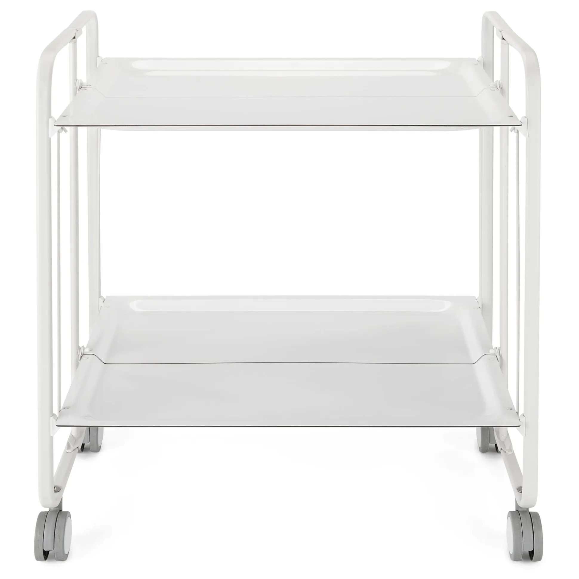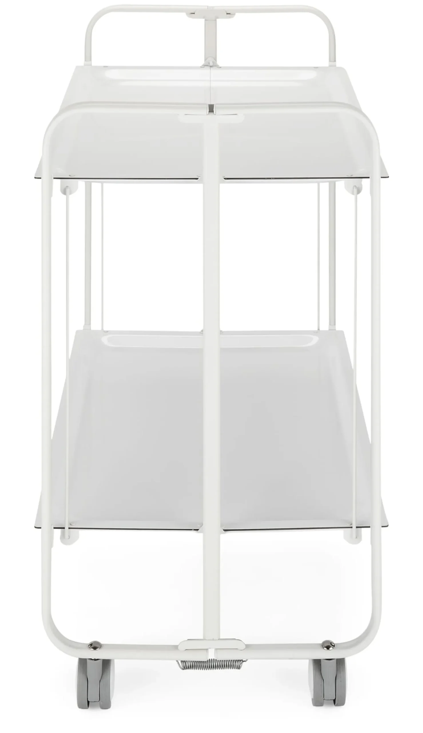 Archetypisches Kleinmöbel mit überzeugenden Materialien und guter Funktion. Die trotz der filigranen Ausführung stabile und robuste Konstruktion ist im Nu auf- und zufaltbar und hat auch halbgeöffnet einen stabilen Stand. Große Rollen halten VALENCIA auch auf textilen Böden und Unebenheiten mobil.