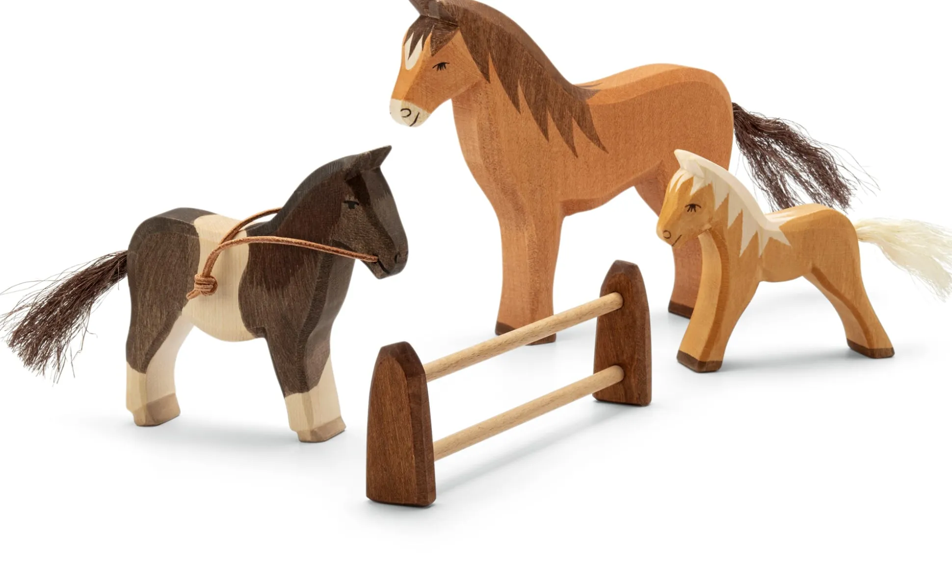 Ahornholz (Herkunft Deutschland, Österreich und Schweiz), von Hand bemalt und geölt. Schweife aus Sisal. Set bestehend aus 1 Pferd (L 15 × B 3 H × 14,5 cm), 1 Pony (L 11 × B 2,5 × H 10,5 cm), 1 Haflingerfohlen (L 8 × B 2,5 × H 8,5 cm) und 1 Hürde (L 16 × B 2 × H 5 cm). Gesamtgewicht 260 g.