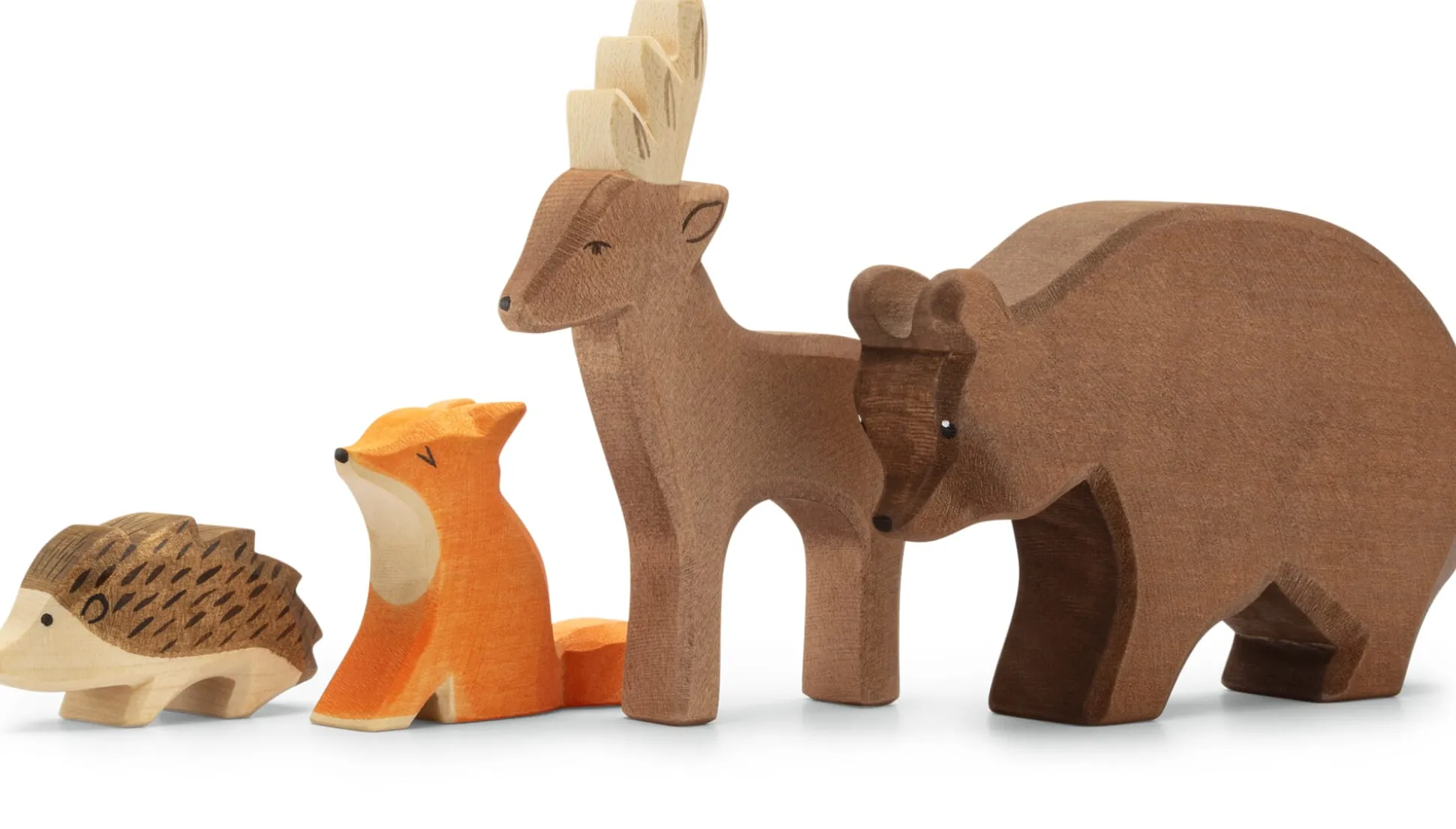 Ahornholz (Herkunft Deutschland, Österreich und Schweiz), von Hand bemalt und geölt. Vierteiliges Set, bestehend aus 1 Bär (L 13 × B 3 × H 9 cm), 1 Rehbock (L 9 × B 2 × H 12,5 cm), 1 Igel (L 6,5 × B 2 × H 4 cm) und 1 Fuchs (L 7,5 × B 2 × H 5,5 cm). Gesamtgewicht 220 g.