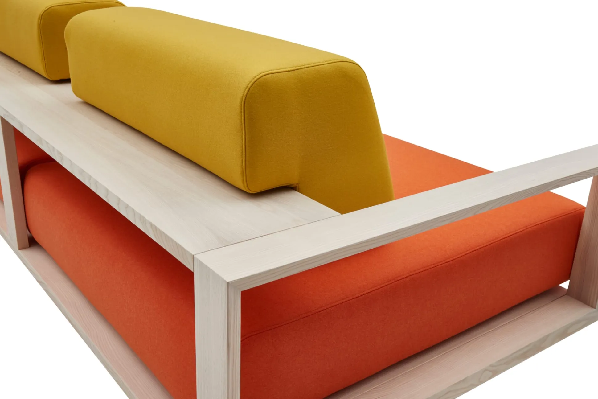 Die Idee, separate Polsterelemente als Sitz und Rückenlehne erdacht in einem Holzrahmen zu platzieren, ist bekannt. Neu hingegen ist diese Art der Gestaltung des raumdefinierenden Holzrahmens, der zum einen die Polster in verschiedenen Positionen aufnimmt und zum anderen unterschiedlich breite Ablageflächen für Arbeit und Alltagsleben bietet. Laptop, Leuchte, Weinglas finden selbstverständlich ihren Platz auf dem Sofa. Und so schafft WOOD Raum für Sitzen und Entspannen, Arbeiten und Lesen und sogar zum Schlafen. Denn ist das Rückenkissen entfernt, ergibt sich eine Liegefläche von 109 x 200 cm.