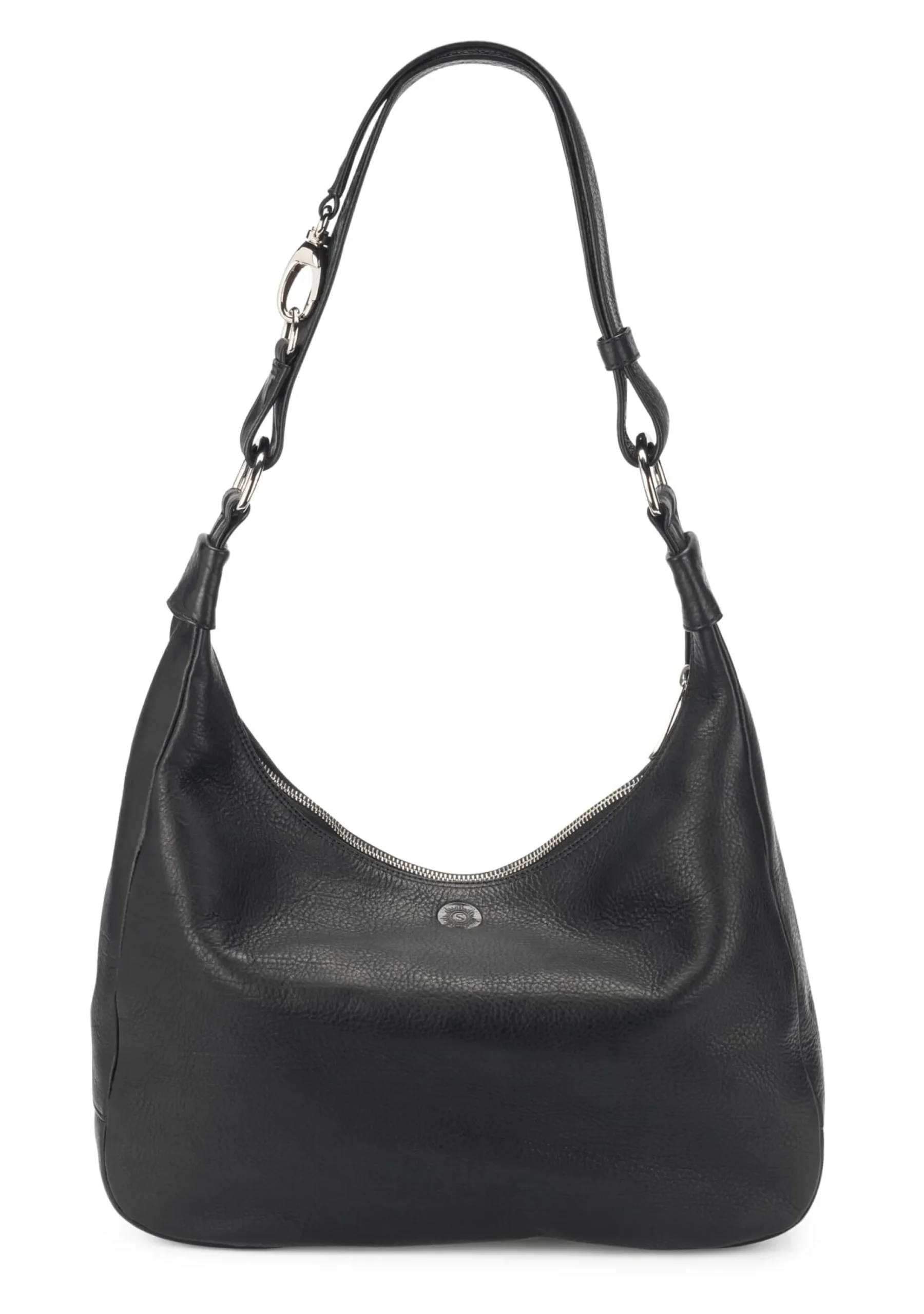 Die landläufige Meinung zu Damenhandtaschen ist wohl die, sie seien nie groß genug – sind sie aber ausreichend dimensioniert, dann findet sich auf die Schnelle nichts darin wieder. Diese Tasche bietet zum einen durch ihre Form viel Platz, erscheint dennoch nicht riesig. Zum anderen ist sie dank des über die ganze Breite verlaufenden Reißverschlusses sehr weit zu öffnen, sodass der Inhalt gut zu überblicken ist und sich sogar Unterlagen im A5-Format und größer im geräumigen Hauptfach verstauen lassen. Innen bieten ein Reißverschlussfach und zwei Steckfächer Platz für die Geldbörse, das Mobiltelefon oder Stifte. Eine eingenähte Lederschlange mit Karabiner sichert die Schlüssel, die man dadurch jederzeit schnell zur Hand hat. Das Leder ist sehr schmiegsam, die Tasche legt sich daher gut in Form und ist angenehm am Körper zu tragen. Ihr Trageriemen lässt sich über einen Karabiner in der Länge verstellen.