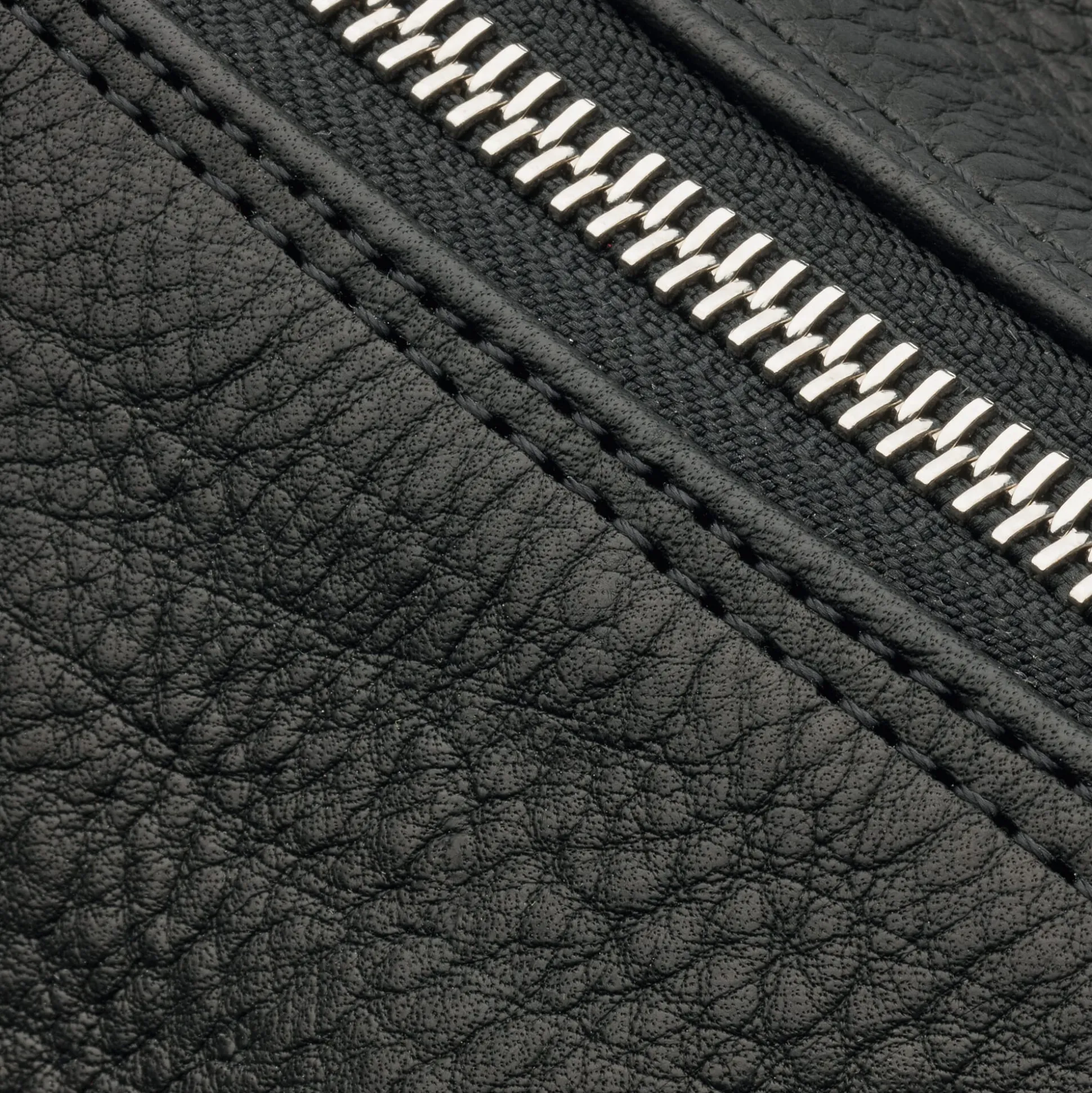 Rindleder (Stärke 2 mm), vegetabil grubengegerbt, Herkunft Deutschland. Die naturfarbene Tasche ist mit einem ecrufarbenen, die schwarze Tasche mit einem blauen Köpergewebe (65% Polyester und 35% Baumwolle) gefüttert. Beide haben einen längenverstellbaren Trageriemen, Gesamtlänge 79 cm, Breite 3,2 cm. Sämtliche Reißverschlüsse und Karabiner sind aus Metall. Hergestellt in Ungarn. Breite 35 cm, Höhe 26 cm, Tiefe 11 cm. Gewicht 770 g.